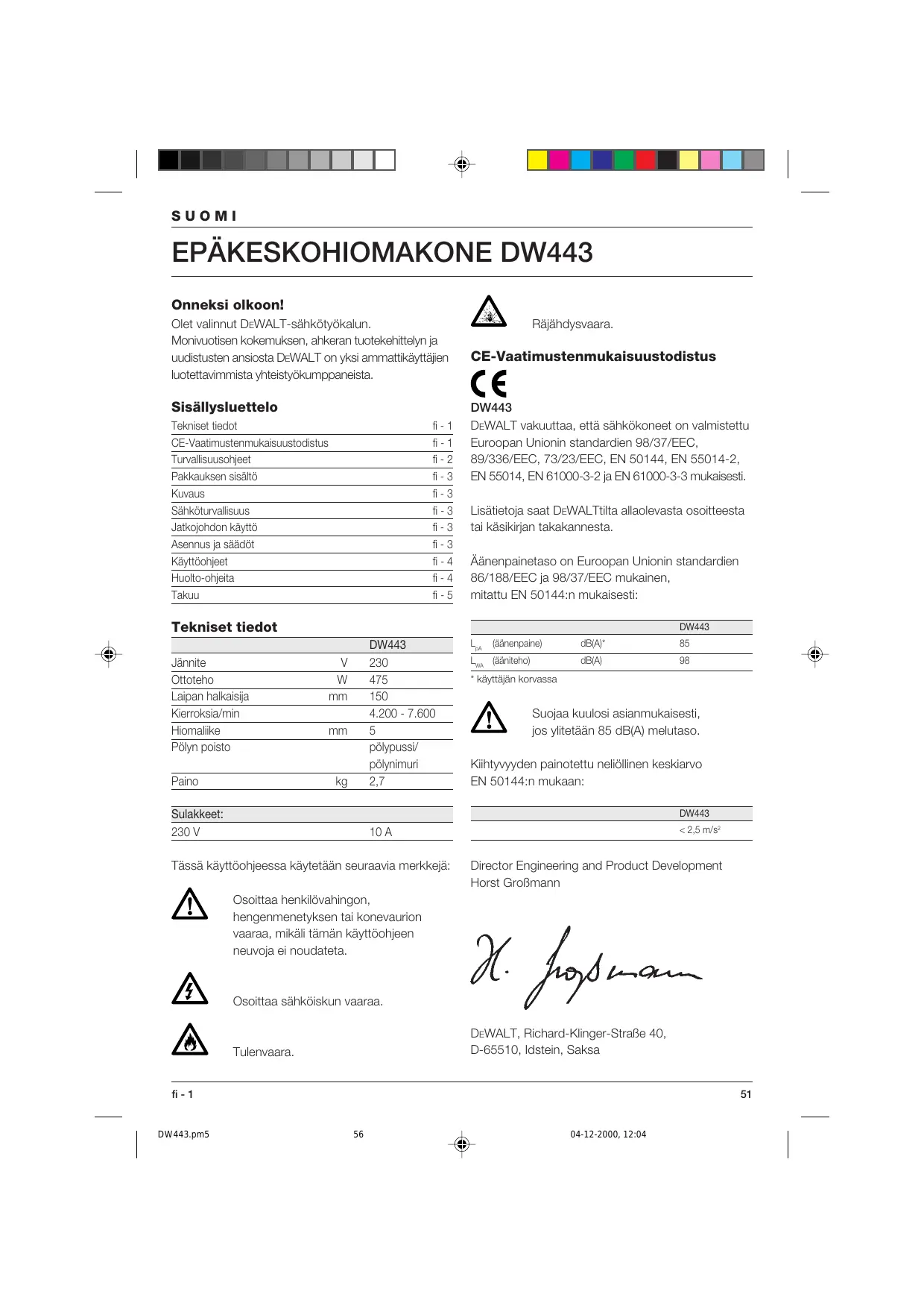 Sisällysluettelo DW443 Tekniset ieot f-1 DEWALT vakuuttaa, että sähkükoneet on valmistettu CE-Vaatimustenmukaisuustodistus fi-1 Euroopan Unionin standardien 98/37/EEC, Turvalisuusohjeet fi-2 89/336/EEC, 73/28/EEC, EN 50144, EN 55014-2, Pakkauksen sisältô fi-3 EN 56014, EN 61000-3-2 ja EN 61000-3-3 mukaisesti Kuvaus i-8 Sähkôturvalisuus fl-3 Lisätietoja saat DEWALTtita allaolevasta osoitteesta Jatkojohdon käyttô f-3 tai käsikijan takakannesta. Asennus ja séädôt i-8 Käyttéohjeet f-4 Aänenpainetaso on Euroopan Unionin standardien Huolto-ohjeita fi-4 86/188/EEC ja 98/37/EEC mukainen, Takuu f-5 mitattu EN 50144:n mukaisesti Tekniset tiedot DW443 DW443 L. (éénenpane) ET 85 Jännite V 230 D. Enteno] GBA œ Ottoteho W 475 * käyttäjän korvassa Laipan hakaisja mm 190 Kierroksia/min 4.200 - 7.600 ÂA Suojaa kuulosi asianmukaisesti, Hiomalike mm 5 jos vlitetään 85 dB(A) melutaso. Pülyn poisto pôlypussi” pôlynimuri Kihtywyyden painotettu neliëllinen keskiarvo Paino kg 27 EN 50144:n mukaan: Sulakkeet: DW443 230 V 10A <25 ms Tässä käyttéohjeessa käytetään seuraavia merkkejät: Osoittaa henkivahingon, hengenmenetyksen tai konevaurion vaaraa, mikäli tämän käyttéohjeen neuvoja ei noudateta.