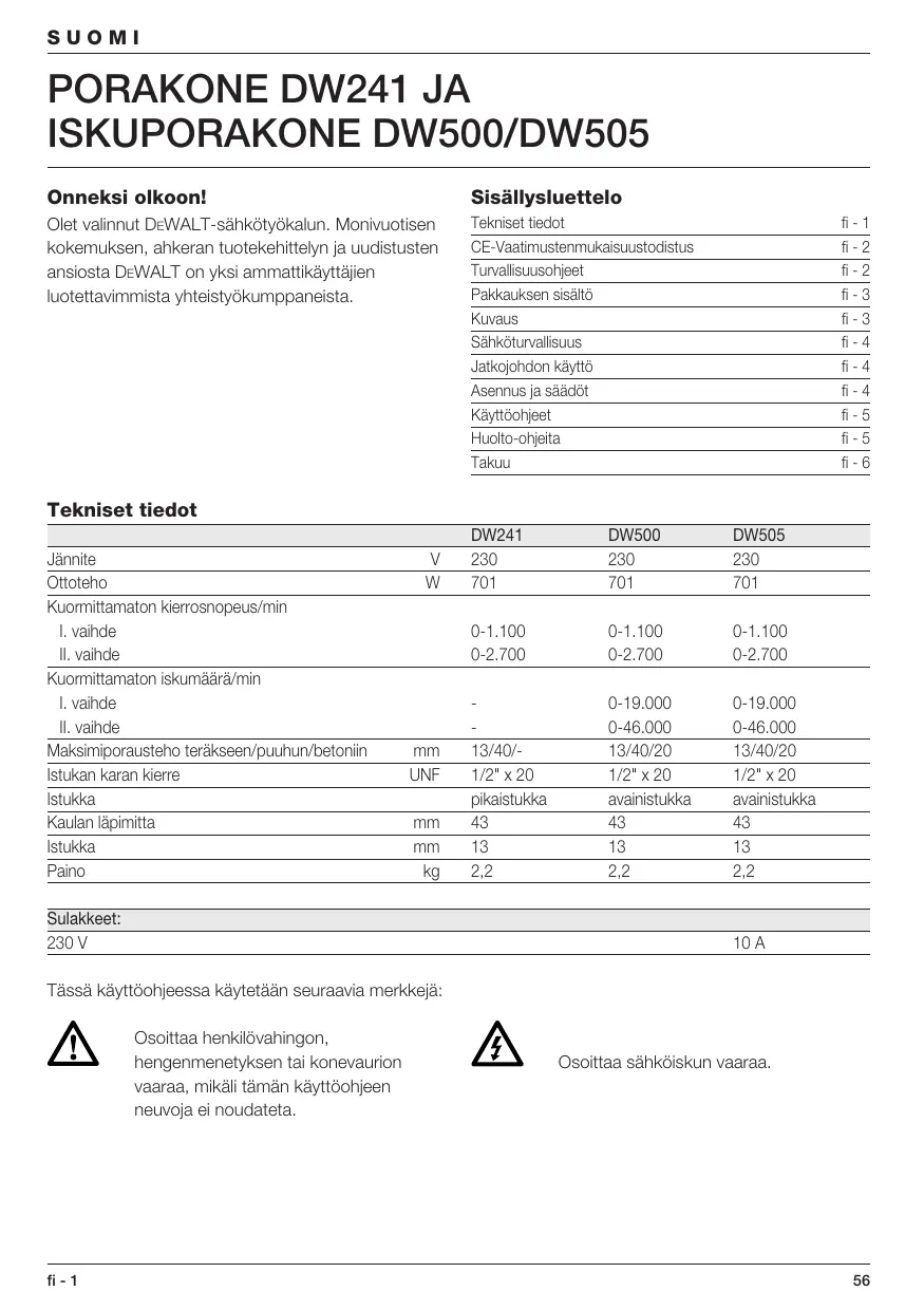 VAROITUS! Sähköiskujen, loukkaantumisten ja palovaaran ehkäisemiseksi on noudatettava seuraavia perusturvallisuustoimenpiteitä. 1 Käytä kuulosuojaimia Eri materiaaleja työstettäessä melutaso saattaa vaihdella ja kohota ajoittain yli 85 dB(A) rajan. Suojaa itsesi ja käytä aina kuulosuojaimia. 2 Pidä työskentelyalue järjestyksessä Epäjärjestys tuo mukanaan onnettomuusvaaran. 3 Ajattele työskentelyalueen vaikutusta työhösi Älä vie sähkötyökalua ulos sateeseen. Älä käytä sitä kosteissa tai märissä tiloissa. Järjestä työalueelle hyvä valaistus. Älä käytä sähkötyökaluja palavien nesteiden tai kaasujen läheisyydessä. 4 Suojaudu sähköiskuilta Vältä kosketusta sähköä johtaviin esineisiin, kuten putkiin, pattereihin, liesiin tai jääkaappeihin. 5 Pidä lapset poissa työskentelyalueelta Älä anna asiantuntemattomien koskettaa sähkötyökalua tai sen liitäntäjohtoa. Ylimääräisten henkilöiden tulisi pysytellä poissa työskentelyalueelta. 6 Säilytä työkalua oikein Kun et käytä työkalua, säilytä sitä kuivassa paikassa. Huolehdi siitä, että säilytyspaikka on lukittu ja niin korkealla, etteivät lapset ylety sinne. 7 Älä ylikuormita sähkötyökalua Liiallisen leikkausvoiman käyttö tai liian suuri työkappaleen syöttönopeus voi ylikuormittaa koneen. Kone toimii paremmin ja turvallisemmin sille suunnitellulla suoritusalueella. 8 Valitse oikea sähkötyökalu Ohjekirjassa on selvitetty laitteen oikea käyttötarkoitus. Ota epävarmoissa tapauksissa yhteys DEWALTin edustajaan. Laitteen tai siihen liitetyn lisälaitteen käyttö ohjekirjan suositusten vastaisesti voi aiheuttaa henkilövahinkoja. Esim. älä sahaa käsipyörösahalla oksia tai polttopuita. 9 Pukeudu asianmukaisesti Älä käytä liian väljiä vaatteita tai koruja. Ne voivat tarttua liikkuviin osiin. Käytä ulkona työskennellessäsi kumihansikkaita ja liukumattomia kenkiä. Jos sinulla on pitkät hiukset, käytä hiusverkkoa. fi - 2 SUOMI 10 Käytä suojalaseja Käytä suojalaseja, etteivät lastut työstettäessä pääse vahingoittamaan silmiä. Mikäli työstettäessä syntyy paljon pölyä, käytä kasvosuojaa. 11 Huolehdi sähköjohdon kunnosta Älä koskaan kanna konetta liitäntäjohdosta äläkä irrota pistoketta seinästä vetämällä johdosta. Suojaa liitäntäjohto kuumuudelta, öljyltä ja teräviltä reunoilta. 12 Kiinnitä työkappale oikein Tarkista aina, että työkappale on kiinnitetty kunnolla. 13 Älä kurottele Seiso aina tukevasti ja tasapainossa. 14 Hoida työkalua huolella Pidä työkalu puhtaana ja terät terävinä. Noudata työkalun huolto-ohjeita sekä terän/ työkalun vaihto-ohjeita. Tarkista liitäntäjohdon kunto säännöllisesti ja anna alan ammattilaisen vaihtaa se tarvittaessa uuteen. Tarkista myös jatkojohto säännöllisesti ja uusi se tarvittaessa. Pidä työkalun kädensijat kuivina ja puhtaina öljystä ja rasvasta. 15 Ota pistoke pois pistorasiasta Irrota pistoke aina pistorasiasta, kun kone ei ole käytössä, kun huollat sitä tai kun vaihdat koneeseen esim. sahan-, poran- tai jyrsinterää. 16 Poista avaimet Poista säätöavaimet ja asennustyökalut koneesta ennen kuin käynnistät sen. 17 Vältä tahatonta käynnistämistä Älä kanna konetta sormet virtakytkimellä koneen ollessa kytkettynä sähköverkkoon. Tarkista, että virtakytkin on pois päältä kun laitat pistokkeen pistorasiaan. 18 Jatkojohdot ulkokäytössä Ulkona työskenneltäessä tulee aina käyttää ulkokäyttöön valmistettuja ja siten merkittyjä jatkojohtoja. 19 Ole tarkkaavainen Keskity työhösi. Käytä tervettä järkeä. Älä käytä sähkötyökalua, kun olet väsynyt. 20 Tarkista, että sähkötyökalu on kunnossa ennen kuin laitat johdon pistorasiaan Ennen kuin otat koneen käyttöön, tarkista turvalaitteet ja kaikki koneen osat. Näin varmistat, että kone toimii sille asetettujen vaatimusten mukaisesti. fi - 3 Tarkista, että liikkuvat osat toimivat moitteettomasti ja että kaikki osat ovat kunnossa ja oikein asennetut. Tarkista myös, että kaikki muut käyttöön mahdollisesti vaikuttavat tekijät ovat kunnossa. Vika suojausjärjestelmässä tai viallinen osa tulee korjata tai vaihtaa valtuutetussa ammattiliikkeessä, mikäli käyttöohjeissa ei toisin mainita. Viallinen virtakytkin tulee vaihtaa alan ammattiliikkeessä. Älä käytä sähkötyökalua, mikäli virtakytkin ei toimi kunnolla. 21 Turvallisuudeksi Käytä vain käyttöohjeessa ja tuotekuvastossa suositeltuja lisävarusteita ja -laitteita. Jonkin muun laitteen käyttö voi aiheuttaa onnettomuuden. 22 Korjauta koneesi DEWALTin valtuuttamalla huoltokorjaamolla Tämä sähkötyökalu on asiaankuuluvien turvallisuusmääräysten mukainen. Turvallisuussyistä vain valtuutetut ammattilaiset saavat huoltaa sähkölaitteita. Pakkauksen sisältö Pakkaus sisältää: 1 (Isku)porakone 1 Sivukahva 1 Poraussyvyyden rajoitin 1 Istukan avain (DW500/DW505) 1 Käyttöohje 1 Hajoituskuva