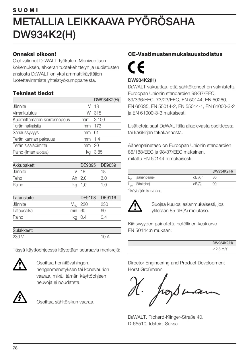 DW934K2(H) Onneksi olkoon! Olet valinnut DEWALT-tyôkalun. Monivuotisen kokemuksen, ahkeran tuotekehittelyn ja uudistusten ansiosta DEWALT on yksi ammattikäyttäjien luotettavimmista yhteistyôkumppaneista. Tekniset tiedot CE-Vaatimustenmukaisuustodistus