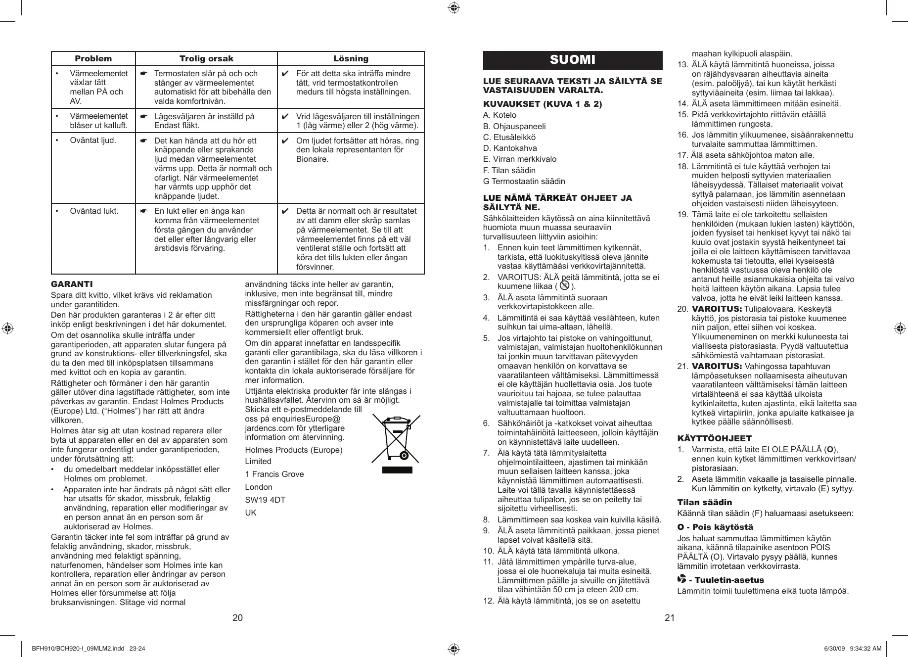 TAKUU Säilytä kuitti, koska tarvitset sitä mahdollisia takuuvaateita varten. Tuotteella on 2 vuoden takuu. Takuuajan lasketaan alkavan ostohetkellä. Jos laite ei tämän takuuajan jälkeen enää toimi suunnittelu- tai valmistusvirheen johdosta, palauta se ostopaikkaan kuitin ja takuutodistuksen kopion kanssa. Tämän takuun myöntämät oikeudet ja edut myönnetään lakisääteisten oikeuksiesi lisäksi, eikä takuu vaikuta kyseisiin lakisääteisiin oikeuksiin. Vain Holmes Products (Europe) Ltd. ("Holmes") -yrityksellä on oikeus muuttaa näitä takuuehtoja. Holmes sitoutuu määritettynä takuuajanjaksona korjaamaan tai vaihtamaan uuteen laitteeseen veloituksetta minkä tahansa viallisen laitteen osan seuraavien ehtojen täyttyessä: • Ostopaikalle tai Holmesille ilmoitetaan ongelmasta heti; ja • Laitetta ei ole muutettu mitenkään tai kohdeltu kaltoin tai vahingoitettu eikä sen korjaukseen tai muutostöihin ole osallistunut muita kuin Holmesin valtuuttamia henkilöitä. Takuu ei kata virheellisestä käytöstä, vahingoittumisesta, laitteen kohtelemisesta väärin, laitteen väärällä jännitteellä
