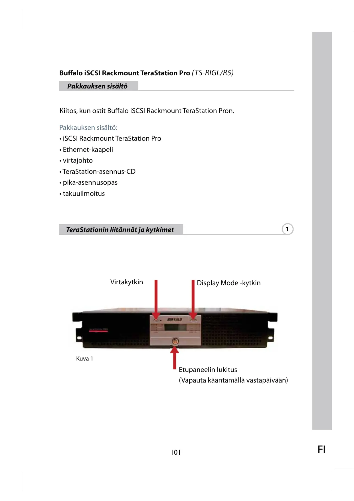 Buffalo iSCSI Rackmount TeraStation Pro (TS-RIGL/R5) Pakkauksen sisältö Kiitos, kun ostit Buffalo iSCSI Rackmount TeraStation Pron. Pakkauksen sisältö: • iSCSI Rackmount TeraStation Pro • Ethernet-kaapeli • virtajohto • TeraStation-asennus-CD • pika-asennusopas • takuuilmoitus