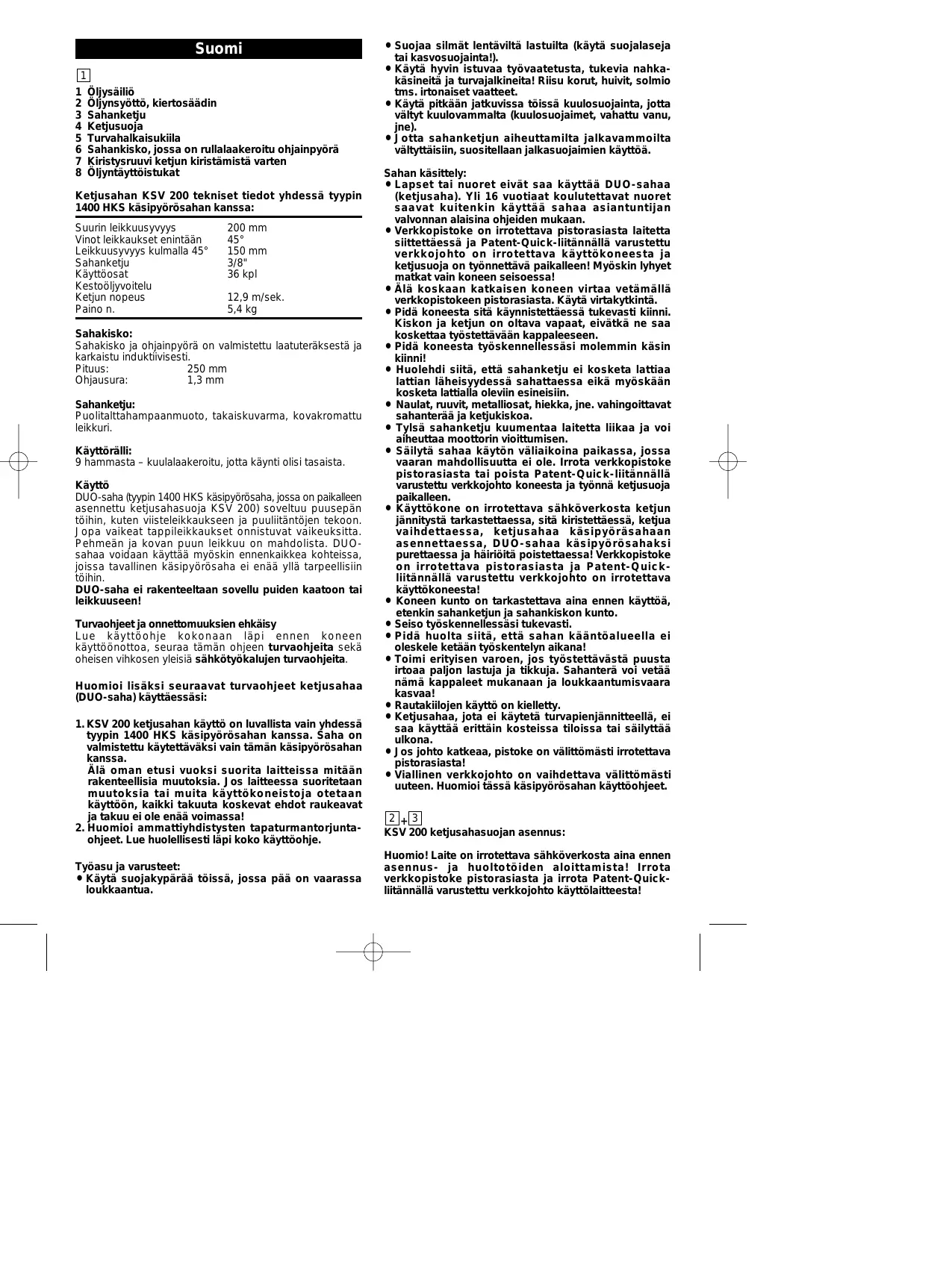Öljysäiliö Öljynsyöttö, kiertosäädin Sahanketju Ketjusuoja Turvahalkaisukiila Sahankisko, jossa on rullalaakeroitu ohjainpyörä Kiristysruuvi ketjun kiristämistä varten Öljyntäyttöistukat Ketjusahan KSV 200 tekniset tiedot yhdessä tyypin 1400 HKS käsipyörösahan kanssa: Suurin leikkuusyvyys Vinot leikkaukset enintään Leikkuusyvyys kulmalla 45° Sahanketju Käyttöosat Kestoöljyvoitelu Ketjun nopeus Paino n. 200 mm 45° 150 mm 3/8" 36 kpl 12,9 m/sek. 5,4 kg Sahakisko: Sahakisko ja ohjainpyörä on valmistettu laatuteräksestä ja karkaistu induktiivisesti. Pituus: 250 mm Ohjausura: 1,3 mm Sahanketju: Puolitalttahampaanmuoto, takaiskuvarma, kovakromattu leikkuri. Käyttörälli: 9 hammasta – kuulalaakeroitu, jotta käynti olisi tasaista. Käyttö DUO-saha (tyypin 1400 HKS käsipyörösaha, jossa on paikalleen asennettu ketjusahasuoja KSV 200) soveltuu puusepän töihin, kuten viisteleikkaukseen ja puuliitäntöjen tekoon. Jopa vaikeat tappileikkaukset onnistuvat vaikeuksitta. Pehmeän ja kovan puun leikkuu on mahdolista. DUOsahaa voidaan käyttää myöskin ennenkaikkea kohteissa, joissa tavallinen käsipyörösaha ei enää yllä tarpeellisiin töihin. DUO-saha ei rakenteeltaan sovellu puiden kaatoon tai leikkuuseen! Turvaohjeet ja onnettomuuksien ehkäisy Lue käyttöohje kokonaan läpi ennen koneen käyttöönottoa, seuraa tämän ohjeen turvaohjeita sekä oheisen vihkosen yleisiä sähkötyökalujen turvaohjeita. Huomioi lisäksi seuraavat turvaohjeet ketjusahaa (DUO-saha) käyttäessäsi: