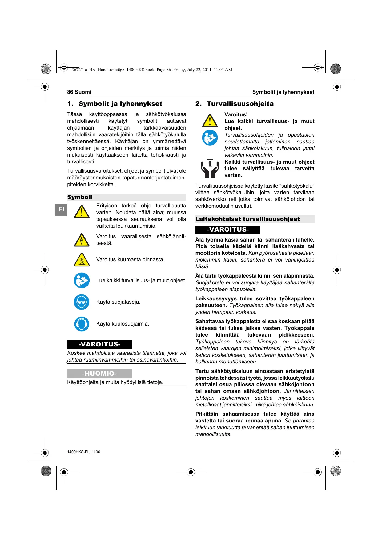 Tässä käyttéoppaassa ja sähkôtyôkalussa mahdollisesti käytetyt symbolit auttavat ohjaamaan käyttäjän tarkkaavaisuuden mahdollisin vaaratekijäihin tällà sähkôtyôkalulla tyôskenneltäessä. Käyttäjän on ymmärrettävä symbolien ja ohjeiden merkitys ja toimia niïden mukaisesti käyttääkseen laitetta tehokkaasti ja turvallisesti Turvallisuusvaroitukset, ohjeet ja symbolit eivät ole määräystenmukaisten tapaturmantorjuntatoimen- piteiden korvikkeita Symboli Erityisen tärkeä ohje turvallisuutta varten. Noudata näità aina; muussa tapauksessa seurauksena voi olla vaikeita loukkaantumisia. Varoitus vaarallisesta sähkôjännit- teestä. Varoitus kuumasta pinnasta. Lue kaikkiturvallisuus- ja muut ohjeet Käytä suojalaseja. Käytä kuulosuojaimia: VAROITUS- Koskee mahdbllista vaarallista tilannetta, joka voi johtaa ruumiinvammoihin tai esinevahinkoihin. Käyttéohjeita ja muita hyôdylisiä tietoja. 1400HKS-F1/ 1108