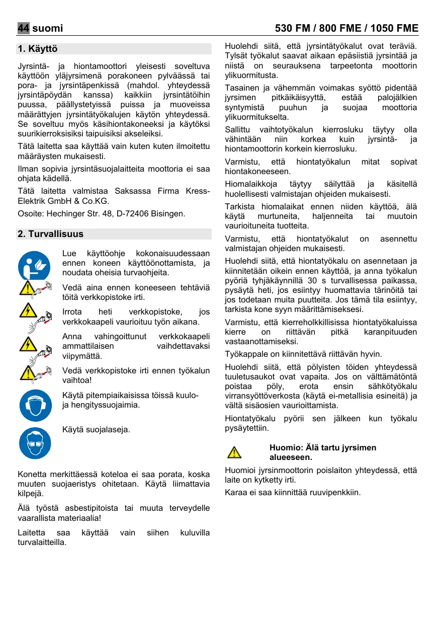Jyrsintä- ja hiontamoottori yleisesti soveltuva käyttöön yläjyrsimenä porakoneen pylväässä tai pora- ja jyrsintäpenkissä (mahdol. yhteydessä jyrsintäpöydän kanssa) kaikkiin jyrsintätöihin puussa, päällystetyissä puissa ja muoveissa määrättyjen jyrsintätyökalujen käytön yhteydessä. Se soveltuu myös käsihiontakoneeksi ja käytöksi suurikierroksisiksi taipuisiksi akseleiksi. Tätä laitetta saa käyttää vain kuten kuten ilmoitettu määräysten mukaisesti. Ilman sopivia jyrsintäsuojalaitteita moottoria ei saa ohjata kädellä. Tätä laitetta valmistaa Saksassa Firma KressElektrik GmbH & Co.KG. Osoite: Hechinger Str. 48, D-72406 Bisingen.