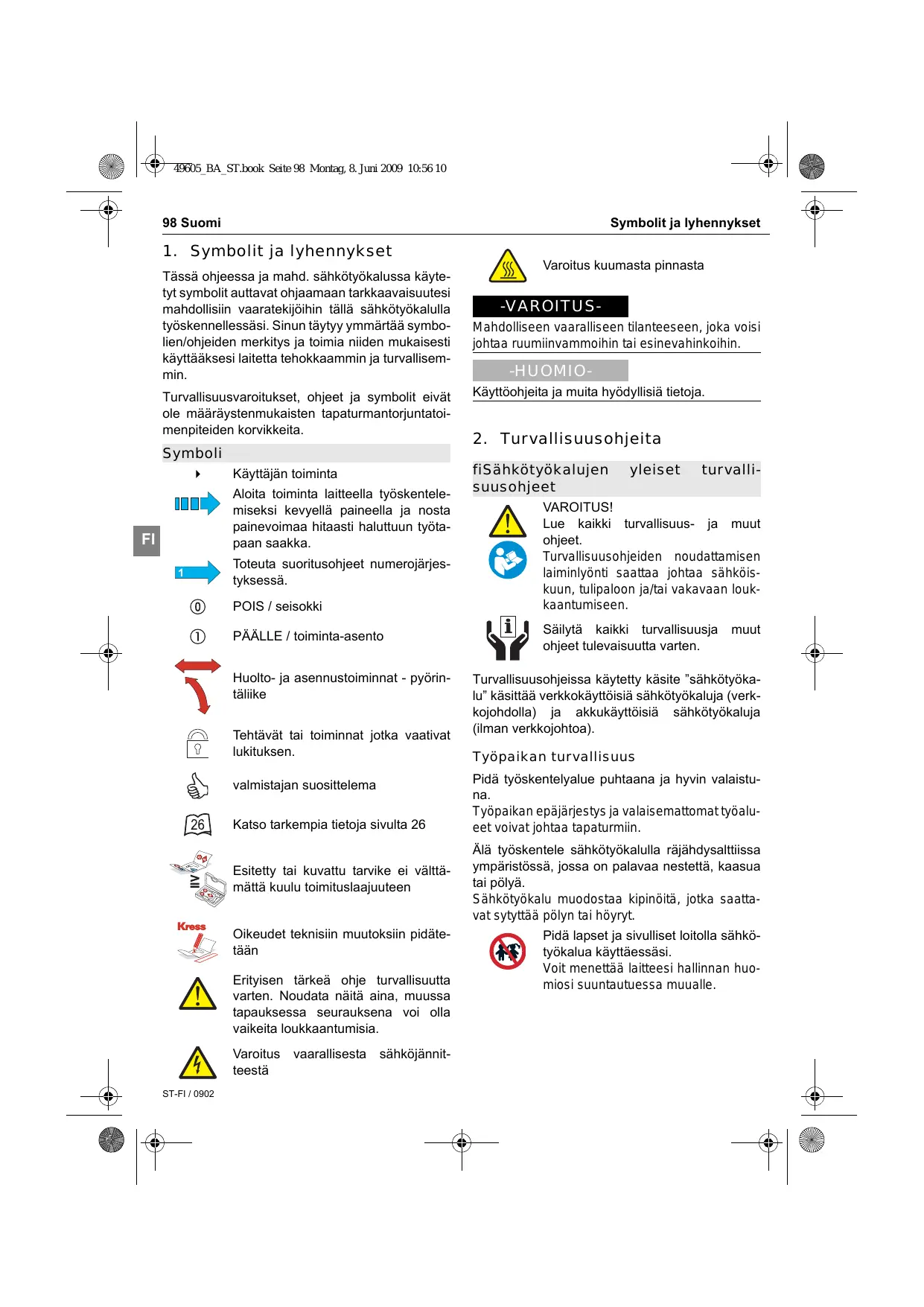 ST-SE / 0902 49605_BA_ST.book Seite 98 Montag, 8. Juni 2009 10:56 10 Alkuperäiset ohjeet "Pistosaha“ 98 Suomi Symbolit ja lyhennykset