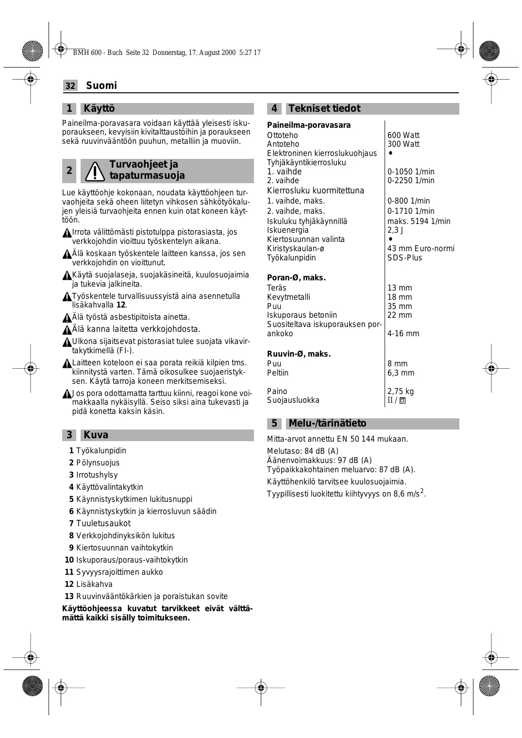 Tekniset tiedot Melu-/tärinätieto Mitta-arvot annettu EN 50 144 mukaan. Melutaso: 84 dB (A) Äänenvoimakkuus: 97 dB (A) Työpaikkakohtainen meluarvo: 87 dB (A). Käyttöhenkilö tarvitsee kuulosuojaimia. Tyypillisesti luokitettu kiihtyvyys on 8,6 m/s 2. BMH 600 - Buch Seite 33 Donnerstag, 17. August 2000 5:27 17 Suomi