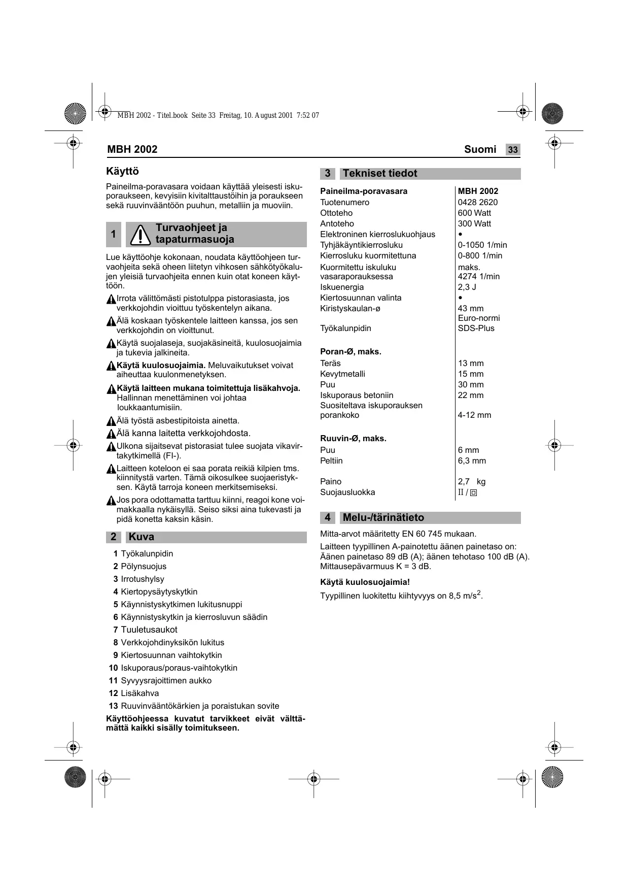 Melu-/tärinätieto Mitta-arvot määritetty EN 60 745 mukaan. Laitteen tyypillinen A-painotettu äänen painetaso on: Äänen painetaso 89 dB (A); äänen tehotaso 100 dB (A). Mittausepävarmuus K = 3 dB. Käytä kuulosuojaimia! Tyypillinen luokitettu kiihtyvyys on 8,5 m/s 2. MBH 2002 - Titel.book Seite 34 Freitag, 10. August 2001 7:52 07