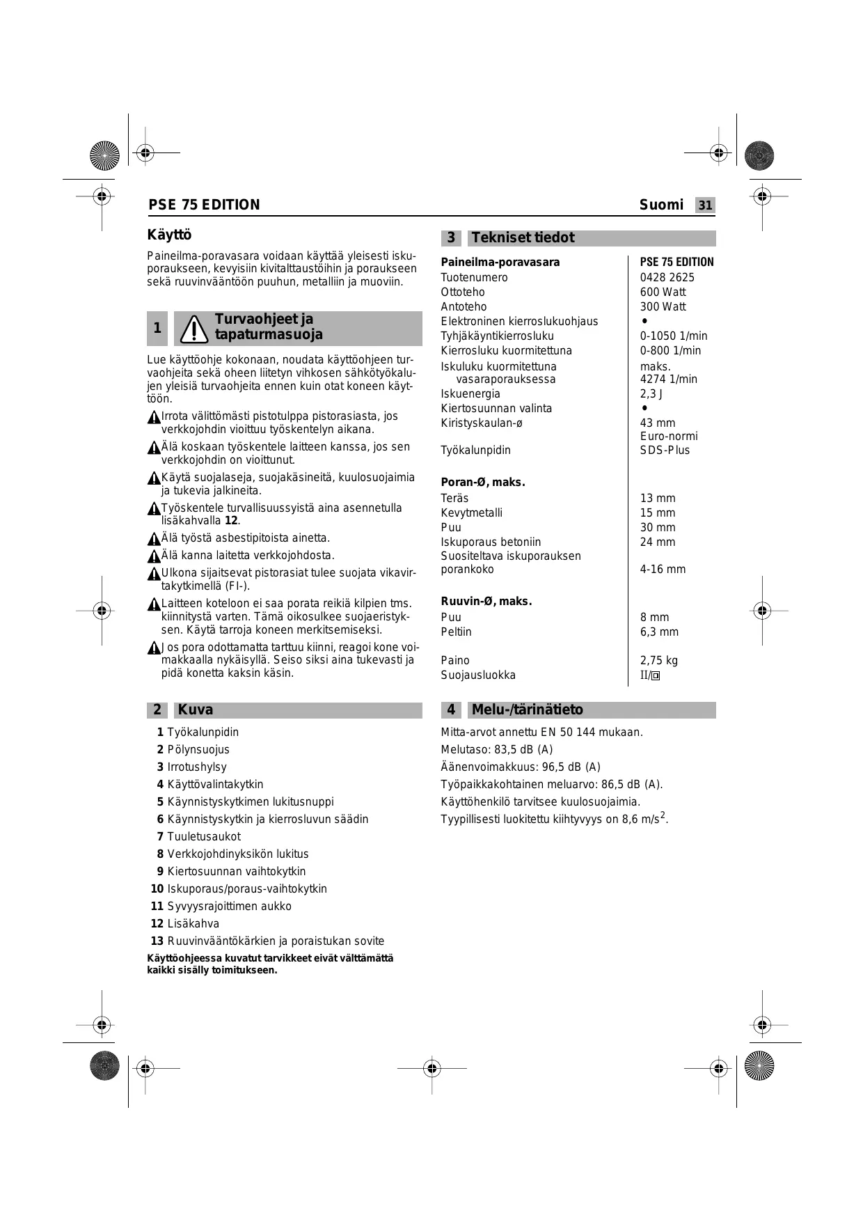 Lue käyttöohje kokonaan, noudata käyttöohjeen turvaohjeita sekä oheen liitetyn vihkosen sähkötyökalujen yleisiä turvaohjeita ennen kuin otat koneen käyttöön. Irrota välittömästi pistotulppa pistorasiasta, jos verkkojohdin vioittuu työskentelyn aikana. Älä koskaan työskentele laitteen kanssa, jos sen verkkojohdin on vioittunut. Käytä suojalaseja, suojakäsineitä, kuulosuojaimia ja tukevia jalkineita. Työskentele turvallisuussyistä aina asennetulla lisäkahvalla 12. Älä työstä asbestipitoista ainetta. Älä kanna laitetta verkkojohdosta. Ulkona sijaitsevat pistorasiat tulee suojata vikavirtakytkimellä (FI-). Laitteen koteloon ei saa porata reikiä kilpien tms. kiinnitystä varten. Tämä oikosulkee suojaeristyksen. Käytä tarroja koneen merkitsemiseksi. Jos pora odottamatta tarttuu kiinni, reagoi kone voimakkaalla nykäisyllä. Seiso siksi aina tukevasti ja pidä konetta kaksin käsin.