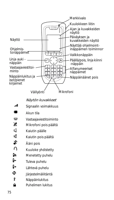 Näytôn kuvakkeet Signaalin voimakkuus Akun tila Vastaajaviestitoiminto. Mikrofoni pois päältà Kaiutin päälle Kaïutin pois päält Âäni pois Kuuloke yhdistetty Menetetty puhelu Tüleva puhelu Lähtevä puhelu Jérjestelmäliitäntä Näppäiniukitus Puhelimen lukitus