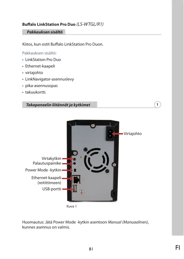 Buffalo LinkStation Pro Duo (LS-WTGL/R1) Pakkauksen sisältö Kiitos, kun ostit Buffalo LinkStation Pro Duon. Pakkauksen sisältö: • LinkStation Pro Duo • Ethernet-kaapeli • virtajohto • LinkNavigator-asennuslevy • pika-asennusopas • takuukortti. Takapaneelin liitännät ja kytkimet