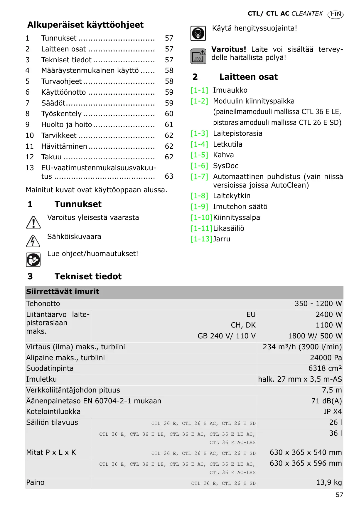 – Varoitus: Laite voi sisältää terveydelle haitallista pölyä. Tyhjennyksen sekä huoltotyöt, mukaanlukien suodatinvaihto, saavat suorittaa vain valtuutetut ammattihenkilöt asiaankuuluvan suojavarustuksen kanssa. Älä käytä laitetta ilman täydellisesti paikalleen asennettua suodatinjärjestelmää. – Käsiteltäessä ja imuroitaessa terveydelle vaarallista pölyä pitää ehdottomasti nou58