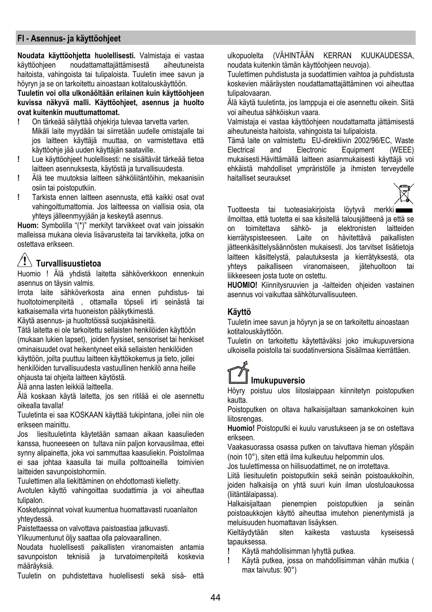 ulkopuolelta (VÄHINTÄÄN KERRAN KUUKAUDESSA, noudata kuitenkin tämän käyttöohjeen neuvoja). Tuulettimen puhdistusta ja suodattimien vaihtoa ja puhdistusta koskevien määräysten noudattamattajättäminen voi aiheuttaa tulipalovaaran. Älä käytä tuuletinta, jos lamppuja ei ole asennettu oikein. Siitä voi aiheutua sähköiskun vaara. Valmistaja ei vastaa käyttöohjeen noudattamatta jättämisestä aiheutuneista haitoista, vahingoista tai tulipaloista. Tämä laite on valmistettu EU-direktiivin 2002/96/EC, Waste Electrical and Electronic Equipment (WEEE) mukaisesti.Hävittämällä laitteen asianmukaisesti käyttäjä voi ehkäistä mahdolliset ympräristölle ja ihmisten terveydelle haitalliset seuraukset