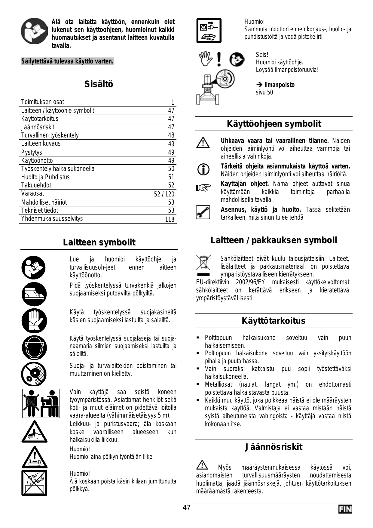 Huomio! Sammuta moottori ennen korjaus-, huolto- ja puhdistustöitä ja vedä pistoke irti. Älä ota laitetta käyttöön, ennenkuin olet lukenut sen käyttöohjeen, huomioinut kaikki huomautukset ja asentanut laitteen kuvatulla tavalla. Seis! Huomioi käyttöohje. Löysää ilmanpoistoruuvia! Säilytettävä tulevaa käyttlö varten. Sisältö Toimituksen osat Laitteen / käyttöohje symbolit Käyttötarkoitus Jäännösriskit Turvallinen työskentely Laitteen kuvaus Pystytys Käyttöönotto Työskentely halkaisukoneella Huolto ja Puhdistus Takuuehdot Varaosat Mahdolliset häiriöt Tekniset tiedot Yhdenmukaisuusselvitys Î Ilmanpoisto sivu 50