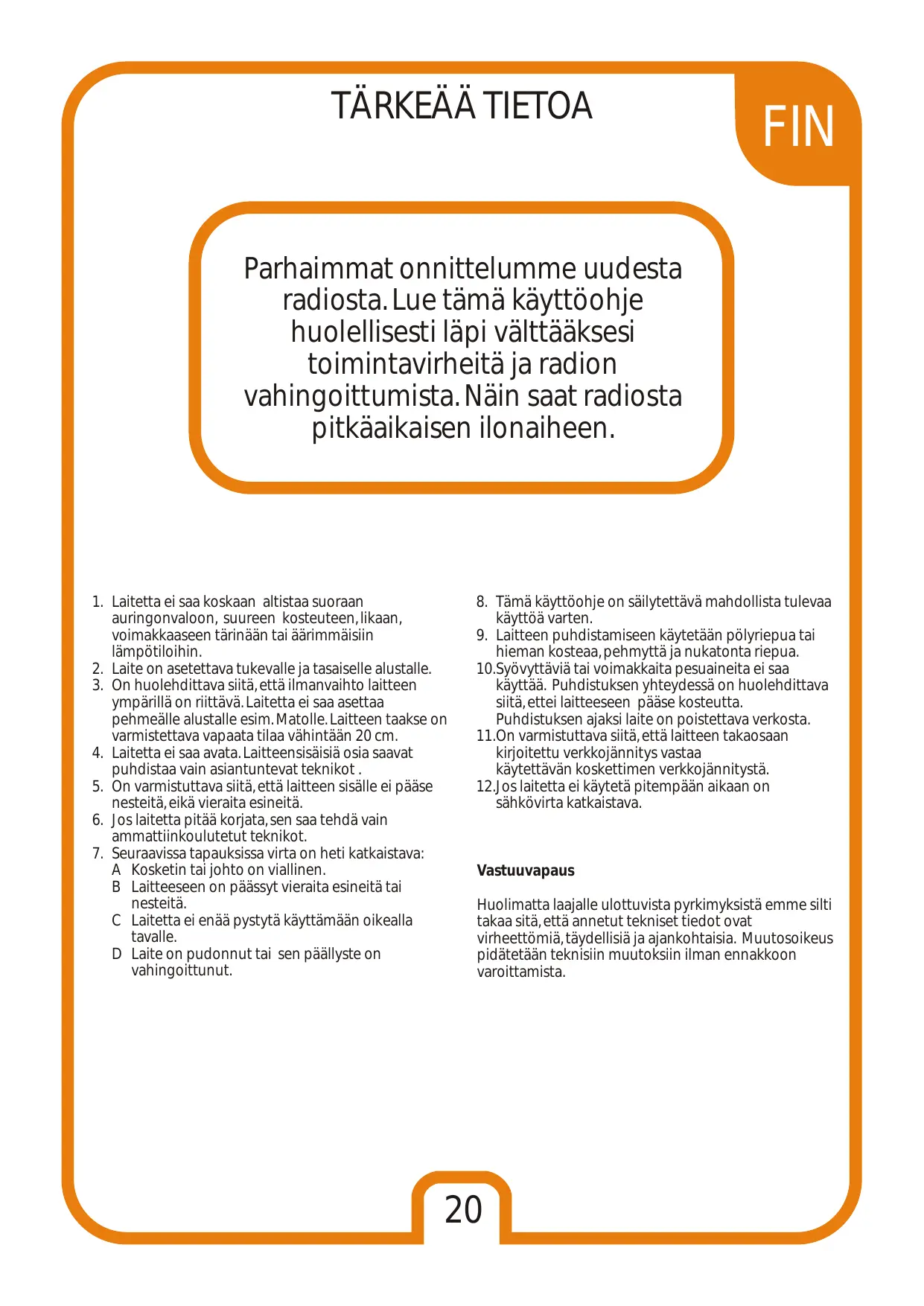 FIN Parhaimmat onnittelumme uudesta radiosta. Lue tämä käyttöohje huolellisesti läpi välttääksesi toimintavirheitä ja radion vahingoittumista. Näin saat radiosta pitkäaikaisen ilonaiheen.