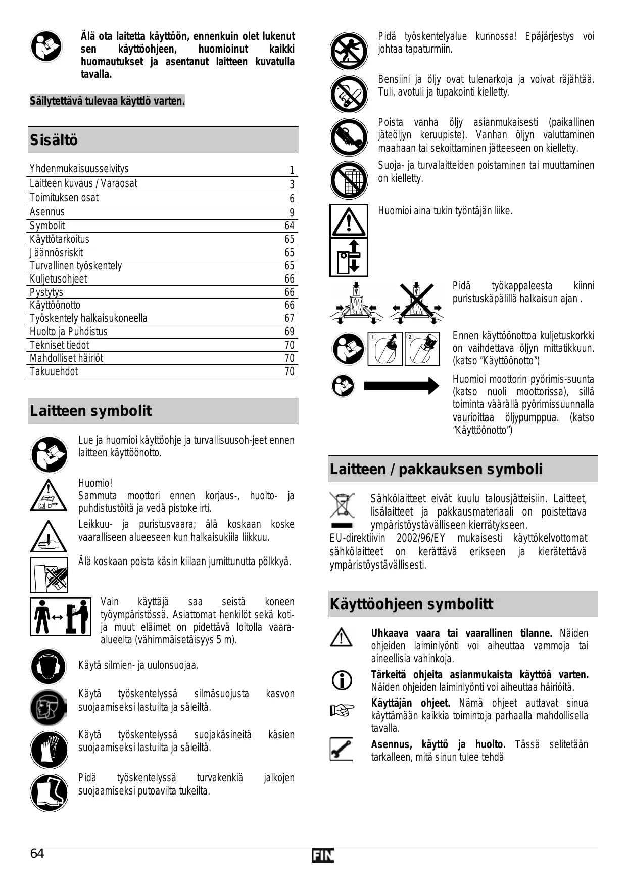 sen käyttéohjeen, huomioinut kaikki huomautukset ja asentanut laitteen kuvatulla tavalla. (és Âlà ota laitetta käyttoôn, ennenkuin olet lukenut Säilytettävä tulevaa käyttlô varten. Sisälto Pidà tyôskentelyalue kunnossa! Epäjärjestys voi © johtaa tapaturmiin. Bensiini ja ôljy ovat tulenarkoja ja voivat réjähtéä. @ Tuli, avotuli ja tupakointi kielletty. Poista vanha ôly asianmukaisesti (paikallinen jêteôlyn keruupiste). Vanhan ôüljyn valuttaminen maahaan tai sekoittaminen jätteeseen on kielletty. Suoja- ja turvalaitteiden poistaminen tai muuttaminen on kielletty. Yhdenmukaisuusselvitys 1 Laitteen kuvaus / Varaosat 3 Toimituksen osat 6 Asennus 9 Symbolit 64 Käyttôtarkoitus 65 Jäännôsriskit 65 Turvallinen tyôskentely 65 Kuljetusohjeet 66 Pystytys 66 Käyttoünotto 66 Tyôskentely halkaisukoneella 67 Huolto ja Puhdistus 69 Tekniset tiedot 70 Mahdolliset häiriôt 70 Takuuehdot 70 Laitteen symbolit Huomio! Sammuta moottori ennen korjaus-, huolto- ja EN puhdistustôità ja vedà pistoke irti. Leikkuu- ja puristusvaara; älà koskaan koske vaaralliseen alueeseen kun halkaisukilla likkuu. Lue ja huomioi käyttohje ja turvallisuusoh-jeet ennen (és) laitteen käyttoünotto. (52 Lx À koskaan poista käsin kilaan jumittunutta pôlkkyä. e ®] Vain Kkäyttäjà saa seistà koneen - ty6ympéristôssä. Asiattomat henkilôt sekä koti- ja muut eläimet on pidettävä loitolla vaara- alueelta (vähimmäisetäisyys 5 m). Käytà silmien- ja uulonsuojaa. Käytà tyôskentelyssä silmäsuojusta kasvon suojaamiseksi lastuilta ja säleiltà. Käytà tyôskentelyssä suojakäsineità käsien suojaamiseksi lastuilta ja säleiltà. Pidà tyôskentelyssäà turvakenkià jalkojen suojaamiseksi putoavilta tukeilta. Huomioi aina tukin tyôntäjän liike. Pidà tyôkappaleesta Kiinni puristuskäpälillà halkaisun ajan . Ennen käyttéünottoa kuljetuskorkki on vaihdettava 6ljyn mittatikkuun. (katso "Käyttoünotto") Huomioi moottorin pyôrimis-suunta (katso nuoli moottorissa), sillà toiminta väärällà pyôrimissuunnalla vaurioittaa ôljypumppua. (katso "Käyttoünotto”) Laitteen / pakkauksen symboli >: Sähkôlaitteet eivät kuulu talousjätteisiin. Laitteet, lisälaitteet ja pakkausmateriaall on poistettava = }mpéristoystävälliseen kierrätykseen. EU-direktivin 2002/96/EŸ mukaisesti käyttôkelvottomat sähkôlaitteet on kerättävä erikseen ja kierätettävä ympéristéystävällisesti. Käyttéohjeen symbolitt Uhkaava vaara tai vaarallinen tilanne. Näiden ohjeiden laiminlyônti voi aiheuttaa vammoja tai aineellisia vahinkoja. Tärkeità ohjeita asianmukaista käyttôà varten. Näiden ohjeiden laiminlyônti voi aiheuttaa häiriôità. Käyttäjän ohjeet. Nämä ohjeet auttavat sinua käyttmään kaikkia toimintoja parhaalla mahdollisella tavalla. Asennus, käyttü ja huolto. Tässä selitetään tarkalleen, mità sinun tulee tehdä N 56 D