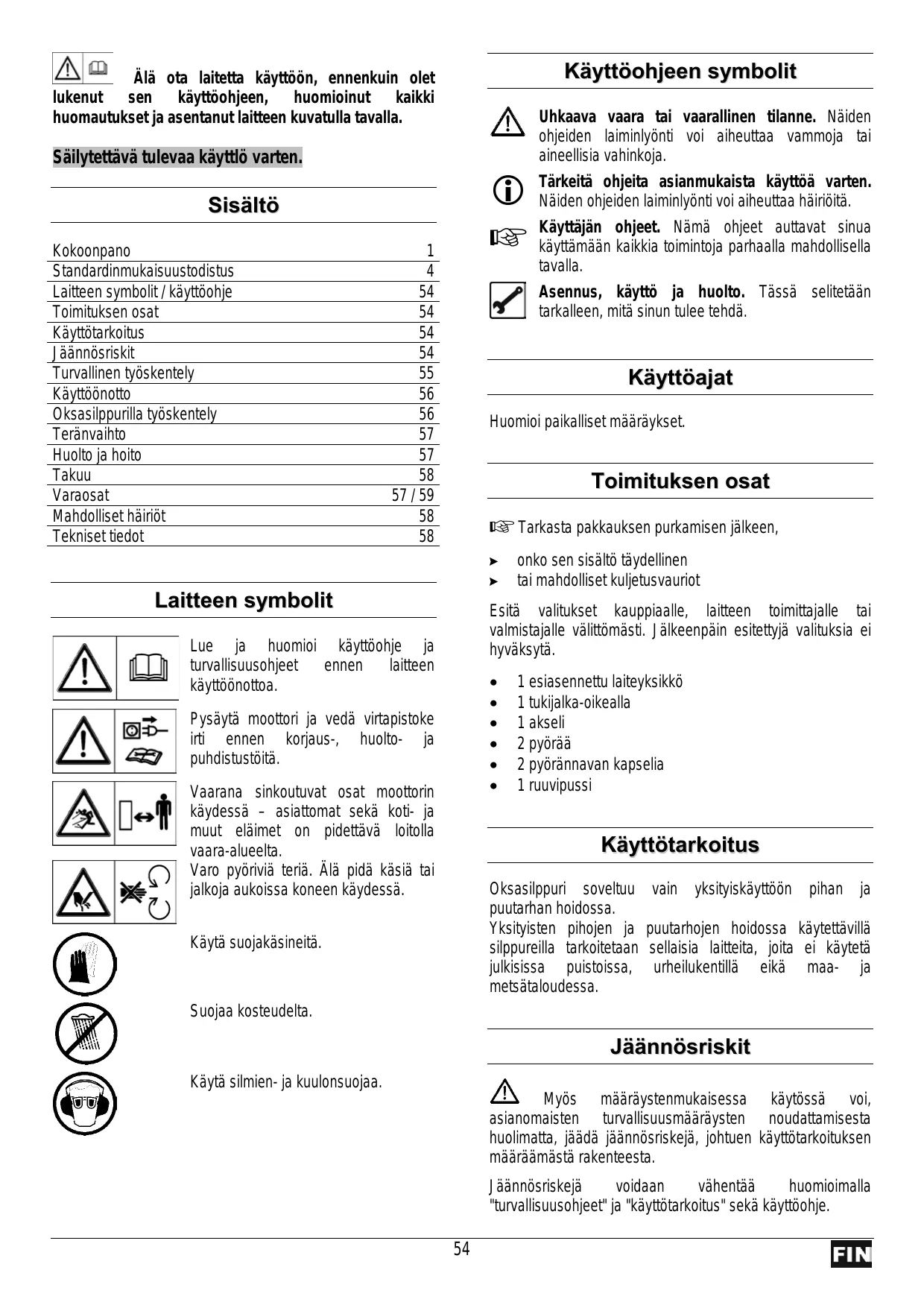 Vaarana sinkoutuvat osat moottorin käydessä - asiattomat sekä koti- ja muut eläimet on pidettäva loitolla vaara-alueelta.