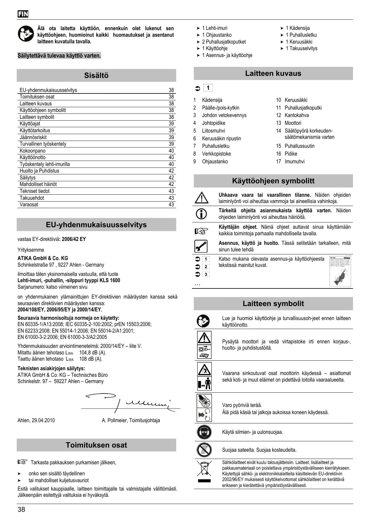 Sisältô EU-yhdenmukaisuusselvitys 38 Toimituksen osat 38 Laitteen kuvaus 38 Käyttoohjeen symbolitt 38 Laitteen symbolit 38 Käyttoajat 39 Käyttôtarkoitus 39 Jäännôsriskit 39 Turvallinen tyôskentely 39 Kokoonpano 40 Käyttoünotto 40 Tyôskentely lehti-imurilla 40 Huolto ja Puhdistus 42 Säilytys 42 Mahdolliset häiriôt 42 Tekniset tiedot 43 Takuuehdot 43 Varaosat 43