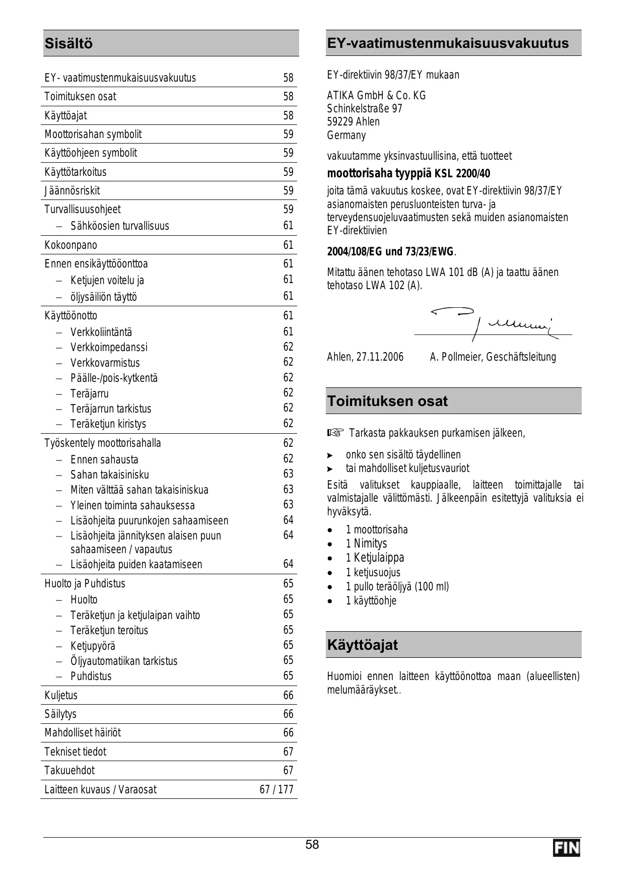 Sisältô EY- vaatimustenmukaisuusvakuutus 58 Toimituksen osat 58 Käyttoajat 58 Moottorisahan symbolit 59 Käyttohjeen symbolit 59 Käyttôtarkoitus 59 Jéännôsriskit 59 Turvallisuusohjeet 59 — Sähkôosien turvallisuus 61 Kokoonpano 61 Ennen ensikäytté6onttoa 61 — _ Ketjujen voitelu ja 61 — Ôljysäiliôn tàyttô 61 Käyttünotto 61 — Verkkolintäntä 61 — Verkkoimpedanssi 62 — Verkkovarmistus 62 — Päälle-/pois-kytkentä 62 — Teräjarru 62 — Teräjarrun tarkistus 62 — Teräketjun kiristys 62 Tyôskentely moottorisahalla 62 — Ennen sahausta 62 — Sahan takaisinisku 63 — Miten välttää sahan takaisiniskua 63 — Yleinen toiminta sahauksessa 63 — _Lisäohjeita puurunkojen sahaamiseen 64 — _Lisäohjeita jännityksen alaisen puun 64 sahaamiseen / vapautus — Lisäohjeita puiden kaatamiseen 64 Huolto ja Puhdistus 65 — Huolto 65 — Teräketjun ja ketjulaipan vaihto 65 — Teräketjun teroitus 65 — Ketjupyôrä 65 — Ôljyautomatikan tarkistus 65 — Puhdistus 65 Kuljetus 66 Säilytys 66 Mahdolliset häiriôt 66 Tekniset tiedot 67 Takuuehdot 67 Laitteen kuvaus / Varaosat 67/177