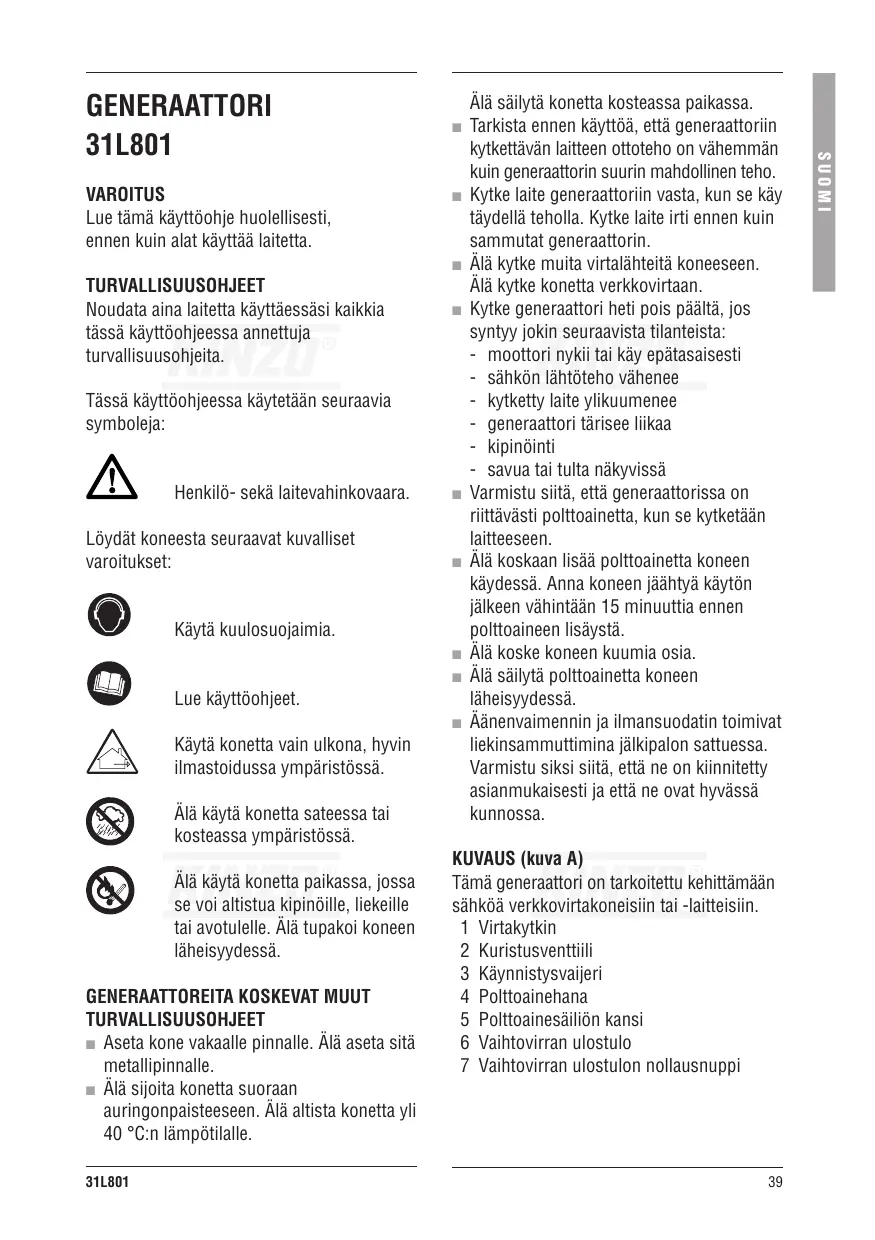 TURVALLISUUSOHJEET ■ Aseta kone vakaalle pinnalle. Älä aseta sitä metallipinnalle. ■ Älä sijoita konetta suoraan auringonpaisteeseen. Älä altista konetta yli 40 °C:n lämpötilalle. 31L801 Älä säilytä konetta kosteassa paikassa. Tarkista ennen käyttöä, että generaattoriin kytkettävän laitteen ottoteho on vähemmän kuin generaattorin suurin mahdollinen teho. Kytke laite generaattoriin vasta, kun se käy täydellä teholla. Kytke laite irti ennen kuin sammutat generaattorin. Älä kytke muita virtalähteitä koneeseen. Älä kytke konetta verkkovirtaan. Kytke generaattori heti pois päältä, jos syntyy jokin seuraavista tilanteista: - moottori nykii tai käy epätasaisesti - sähkön lähtöteho vähenee - kytketty laite ylikuumenee - generaattori tärisee liikaa - kipinöinti - savua tai tulta näkyvissä Varmistu siitä, että generaattorissa on riittävästi polttoainetta, kun se kytketään laitteeseen. Älä koskaan lisää polttoainetta koneen käydessä. Anna koneen jäähtyä käytön jälkeen vähintään 15 minuuttia ennen polttoaineen lisäystä. Älä koske koneen kuumia osia. Älä säilytä polttoainetta koneen läheisyydessä. Äänenvaimennin ja ilmansuodatin toimivat liekinsammuttimina jälkipalon sattuessa. Varmistu siksi siitä, että ne on kiinnitetty asianmukaisesti ja että ne ovat hyvässä kunnossa. KUVAUS (kuva A) Tämä generaattori on tarkoitettu kehittämään sähköä verkkovirtakoneisiin tai -laitteisiin. 1 Virtakytkin 2 Kuristusventtiili 3 Käynnistysvaijeri 4 Polttoainehana 5 Polttoainesäiliön kansi 6 Vaihtovirran ulostulo 7 Vaihtovirran ulostulon nollausnuppi
