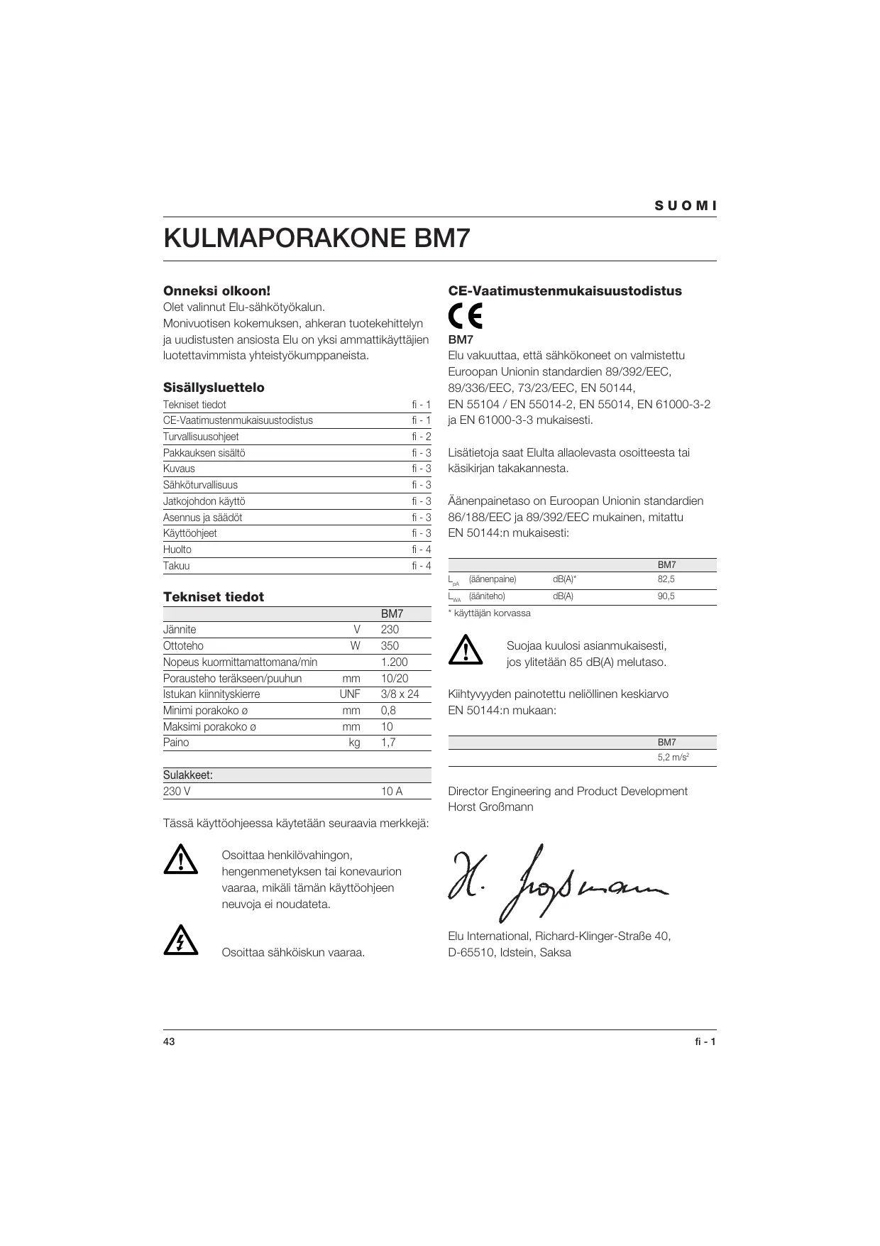 Il livello di rumorosità è conforme alle norme 86/188/CEE e 89/392/CEE, dati ricavati in base alla norma EN 50144: BM7 EN 61000-3-3. Neem voor meer informatie contact op met Elu, zie het adres hieronder of op de achterkant van deze handleiding. Niveau van de geluidsdruk overeenkomstig 86/188/EEG & 89/392/EEG, gemeten volgens EN 50144: BM7