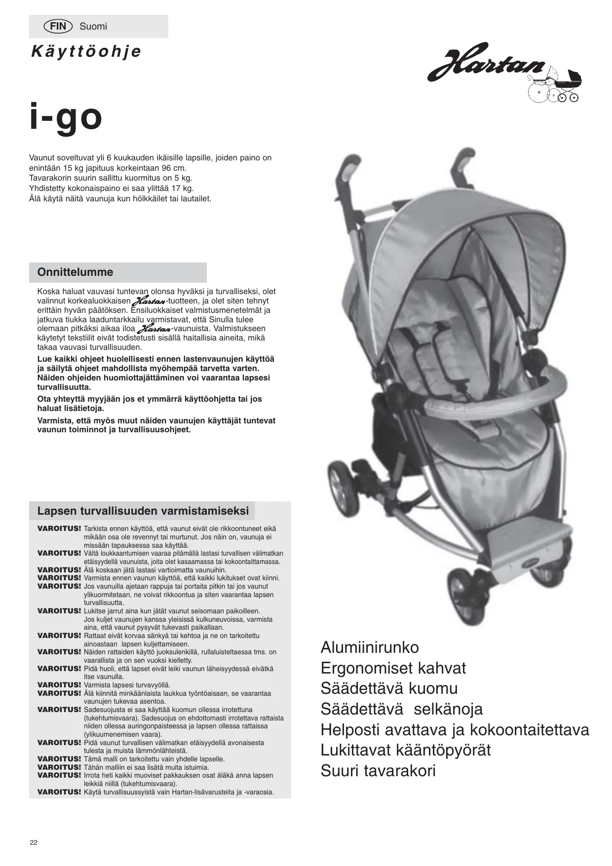 FIN Suomi Käyttöohje i-go Vaunut soveltuvat yli 6 kuukauden ikäisille lapsille, joiden paino on enintään 15 kg japituus korkeintaan 96 cm. Tavarakorin suurin sallittu kuormitus on 5 kg. Yhdistetty kokonaispaino ei saa ylittää 17 kg. Älä käytä näitä vaunuja kun hölkkäilet tai lautailet. Onnittelumme Koska haluat vauvasi tuntevan olonsa hyväksi ja turvalliseksi, olet valinnut korkealuokkaisen -tuotteen, ja olet siten tehnyt erittäin hyvän päätöksen. Ensiluokkaiset valmistusmenetelmät ja jatkuva tiukka laaduntarkkailu varmistavat, että Sinulla tulee olemaan pitkäksi aikaa iloa -vaunuista. Valmistukseen käytetyt tekstiilit eivät todistetusti sisällä haitallisia aineita, mikä takaa vauvasi turvallisuuden. Lue kaikki ohjeet huolellisesti ennen lastenvaunujen käyttöä ja säilytä ohjeet mahdollista myöhempää tarvetta varten. Näiden ohjeiden huomiottajättäminen voi vaarantaa lapsesi turvallisuutta. Ota yhteyttä myyjään jos et ymmärrä käyttöohjetta tai jos haluat lisätietoja. Varmista, että myös muut näiden vaunujen käyttäjät tuntevat vaunun toiminnot ja turvallisuusohjeet. Lapsen turvallisuuden varmistamiseksi VAROITUS! Tarkista ennen käyttöä, että vaunut eivät ole rikkoontuneet eikä mikään osa ole revennyt tai murtunut. Jos näin on, vaunuja ei missään tapauksessa saa käyttää. VAROITUS! Vältä loukkaantumisen vaaraa pitämällä lastasi turvallisen välimatkan etäisyydellä vaunuista, joita olet kasaamassa tai kokoontaittamassa. VAROITUS! Älä koskaan jätä lastasi vartioimatta vaunuihin. VAROITUS! Varmista ennen vaunun käyttöä, että kaikki lukitukset ovat kiinni. VAROITUS! Jos vaunuilla ajetaan rappuja tai portaita pitkin tai jos vaunut ylikuormitetaan, ne voivat rikkoontua ja siten vaarantaa lapsen turvallisuutta. VAROITUS! Lukitse jarrut aina kun jätät vaunut seisomaan paikoilleen. Jos kuljet vaunujen kanssa yleisissä kulkuneuvoissa, varmista aina, että vaunut pysyvät tukevasti paikallaan. VAROITUS! Rattaat eivät korvaa sänkyä tai kehtoa ja ne on tarkoitettu ainoastaan lapsen kuljettamiseen. VAROITUS! Näiden rattaiden käyttö juoksulenkillä, rullaluisteltaessa tms. on vaarallista ja on sen vuoksi kielletty. VAROITUS! Pidä huoli, että lapset eivät leiki vaunun läheisyydessä eivätkä itse vaunulla. VAROITUS! Varmista lapsesi turvavyöllä. VAROITUS! Älä kiinnitä minkäänlaista laukkua työntöaisaan, se vaarantaa vaunujen tukevaa asentoa. VAROITUS! Sadesuojusta ei saa käyttää kuomun ollessa irrotettuna (tukehtumisvaara). Sadesuojus on ehdottomasti irrotettava rattaista niiden ollessa auringonpaisteessa ja lapsen ollessa rattaissa (ylikuumenemisen vaara). VAROITUS! Pidä vaunut turvallisen välimatkan etäisyydellä avonaisesta tulesta ja muista lämmönlähteistä. VAROITUS! Tämä malli on tarkoitettu vain yhdelle lapselle. VAROITUS! Tähän malliin ei saa lisätä muita istuimia. VAROITUS! Irrota heti kaikki muoviset pakkauksen osat äläkä anna lapsen leikkiä niillä (tukehtumisvaara). VAROITUS! Käytä turvallisuussyistä vain Hartan-lisävarusteita ja -varaosia.