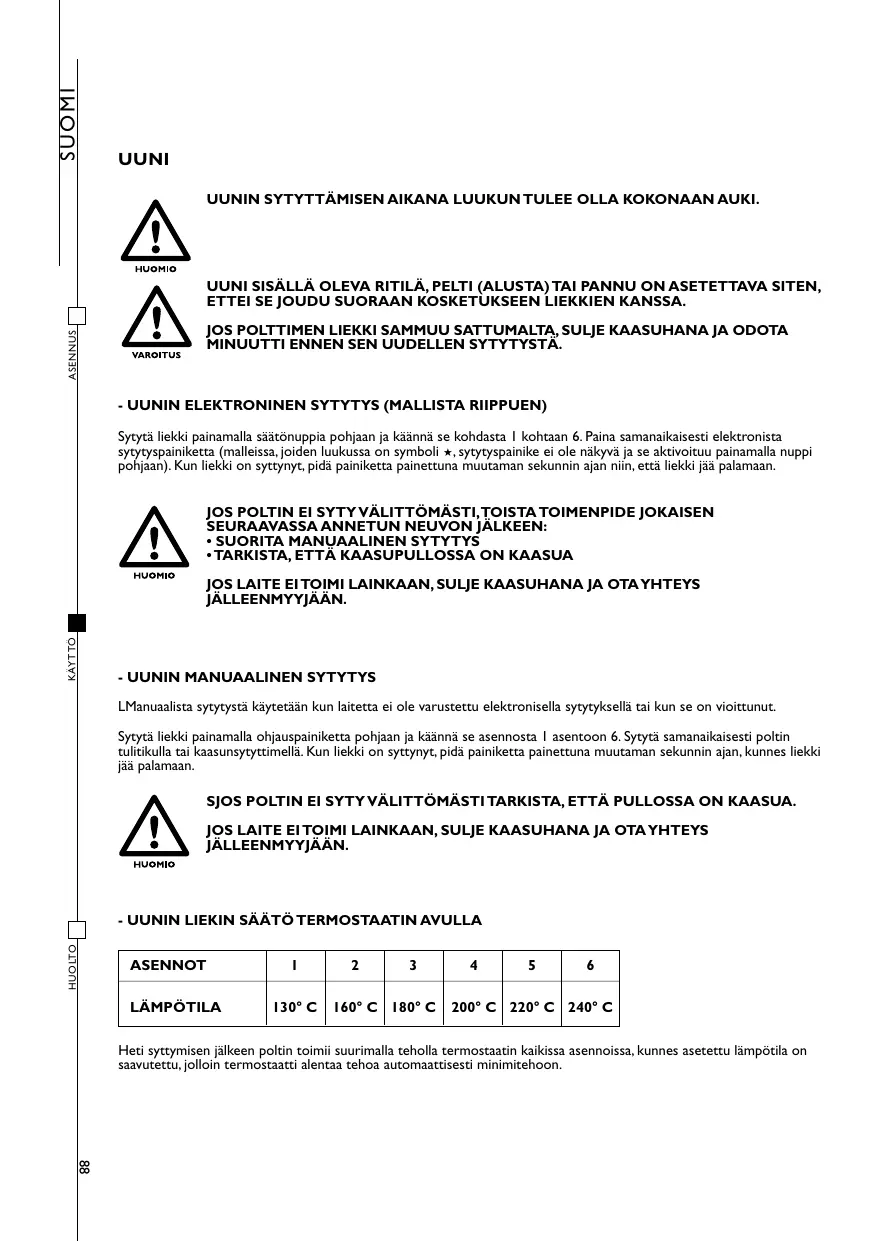 MALLI SUOMI UUNI UUNIN SYTYTTÄMISEN AIKANA LUUKUN TULEE OLLA KOKONAAN AUKI. UUNI SISÄLLÄ OLEVA RITILÄ, PELTI (ALUSTA) TAI PANNU ON ASETETTAVA SITEN, ETTEI SE JOUDU SUORAAN KOSKETUKSEEN LIEKKIEN KANSSA. ASENNUS JOS POLTTIMEN LIEKKI SAMMUU SATTUMALTA, SULJE KAASUHANA JA ODOTA MINUUTTI ENNEN SEN UUDELLEN SYTYTYSTÄ. - UUNIN ELEKTRONINEN SYTYTYS (MALLISTA RIIPPUEN) Sytytä liekki painamalla säätönuppia pohjaan ja käännä se kohdasta 1 kohtaan 6. Paina samanaikaisesti elektronista sytytyspainiketta (malleissa, joiden luukussa on symboli ★, sytytyspainike ei ole näkyvä ja se aktivoituu painamalla nuppi pohjaan). Kun liekki on syttynyt, pidä painiketta painettuna muutaman sekunnin ajan niin, että liekki jää palamaan. JOS POLTIN EI SYTY VÄLITTÖMÄSTI,TOISTA TOIMENPIDE JOKAISEN SEURAAVASSA ANNETUN NEUVON JÄLKEEN:
