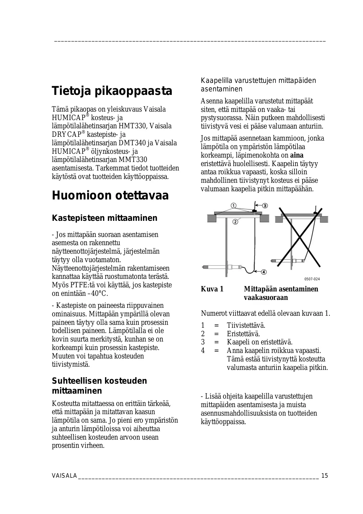 Tietoja pikaoppaasta Tämä pikaopas on yleiskuvaus Vaisala HUMICAP® kosteus- ja lämpötilalähetinsarjan HMT330, Vaisala DRYCAP® kastepiste- ja lämpötilalähetinsarjan DMT340 ja Vaisala HUMICAP® öljynkosteus- ja lämpötilalähetinsarjan MMT330 asentamisesta. Tarkemmat tiedot tuotteiden käytöstä ovat tuotteiden käyttöoppaissa. Huomioon otettavaa Kaapelilla varustettujen mittapäiden asentaminen Asenna kaapelilla varustetut mittapäät siten, että mittapää on vaaka- tai pystysuorassa. Näin putkeen mahdollisesti tiivistyvä vesi ei pääse valumaan anturiin. Jos mittapää asennetaan kammioon, jonka lämpötila on ympäristön lämpötilaa korkeampi, läpimenokohta on aina eristettävä huolellisesti. Kaapelin täytyy antaa roikkua vapaasti, koska silloin mahdollinen tiivistynyt kosteus ei pääse valumaan kaapelia pitkin mittapäähän. Kastepisteen mittaaminen - Jos mittapään suoraan asentamisen asemesta on rakennettu näytteenottojärjestelmä, järjestelmän täytyy olla vuotamaton. Näytteenottojärjestelmän rakentamiseen kannattaa käyttää ruostumatonta terästä. Myös PTFE:tä voi käyttää, jos kastepiste on enintään –40°C. - Kastepiste on paineesta riippuvainen ominaisuus. Mittapään ympärillä olevan paineen täytyy olla sama kuin prosessin todellisen paineen. Lämpötilalla ei ole kovin suurta merkitystä, kunhan se on korkeampi kuin prosessin kastepiste. Muuten voi tapahtua kosteuden tiivistymistä. Suhteellisen kosteuden mittaaminen Kosteutta mitattaessa on erittäin tärkeää, että mittapään ja mitattavan kaasun lämpötila on sama. Jo pieni ero ympäristön ja anturin lämpötiloissa voi aiheuttaa suhteellisen kosteuden arvoon usean prosentin virheen. 0507-024 Kuva 1 Mittapään asentaminen vaakasuoraan Numerot viittaavat edellä olevaan kuvaan 1.