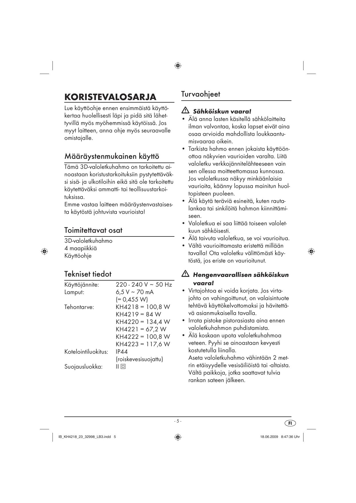 Valoletkuhahmon pystyttäminen Puhdistus ja hoito © Ota valoletkuhahmo pakkauksesta. © Poista kaikki mahdolliset kuljetusvarmis- tukset ja teipit/liimakalvot. © Aseta valoletkuhahmo soveltuvalle pinnalle. Käännä kuusihahmon (KH4222) ja lumiukkohahmon (KH4220] molemmat rautalankaelementit varovasti irti toi- sistaan niin, että hahmot voivat seistä pystyssä. © Kiinnitä valoletkuhahmot tarvittaessa mukana tulevilla maapiükeillä maahan. © Liitä valoletkuhahmo asianmukaisesti asennettuun 230 Vin kotitalouspistora- siaan. © Jos haluat sammuttaa valoletkuhahmon valaisutoiminnon, irrota sen virtajohto pistorasiasta. © Varastoi valoletkuhahmot niden pakkauk- sissa sellaisina aikoina, jolloin nitä ei tarvita. À Hengenvaarallisen sähkôiskun vaara: +_Irrota ensiksi verkkopistoke pistorasiasta. + Àlä koskaan upota valoletkuhahmoa veteen tai muihin nesteisin! + Àlä päästä valoletkuun tunkeutumaan nesteitä. © Anna valoletkuhahmon jäähtyä tarvitta- essa ensin ennen puhdistuksen aloitta- mista. Valoletkun puhdistaminen: © Puhdista valoletku kevyesti kostutetulla linalla. Âlä koskaan käytä bensiniä, livottimia tai puhdistusaineita, jotka vahingoittavat muovial Huolto + Valoletkussa ei ole yhtään osaa, jota käyttäjàä voisi huoltaa. & Hävittäminen Alä missään tapauksessa heitä lai- tetta tavallisen talousjätteen sekaan. Tämä tuote on eurooppalaisen di- rektivin 2002/96/EC mukainen. + Hävitä tuote hyväksytyn jätehuoltoyrityk- sen tai kunnallisen jätehuollon kautta. + Noudata voimassa olevia määräyksiä. Ota epäselvissä tilanteissa yhteyttä pai- kalliseen jätehuoltoviranomaiseen. Hävitä kaïkki pakkausmateriaalit ympäristéystävällisellä tavalla. IB_KH4218_28 82008 LB3.indd 7
