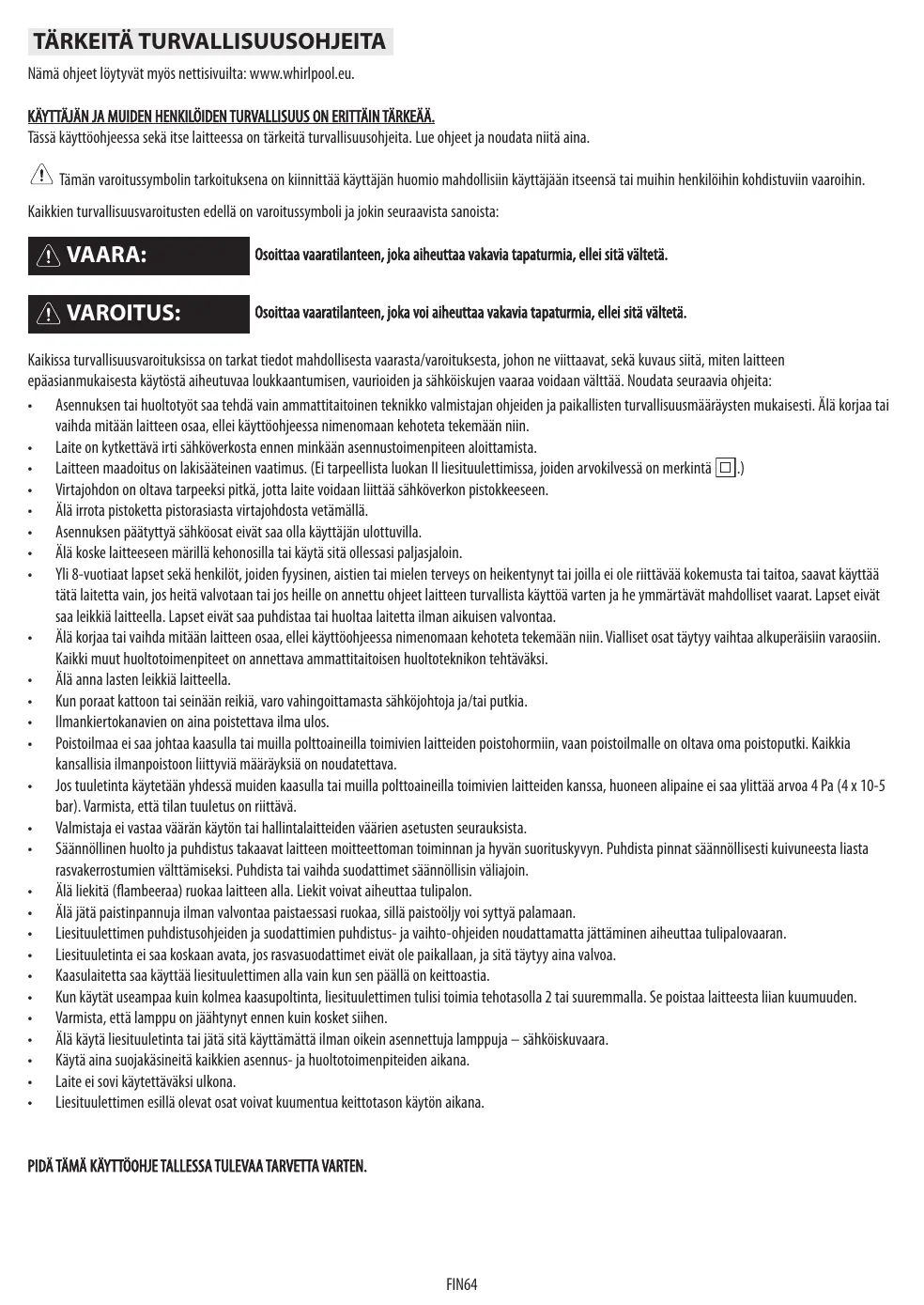 TÄRKEITÄ TURVALLISUUSOHJEITA Nämä ohjeet löytyvät myös nettisivuilta: www.whirlpool.eu. KÄYTTÄJÄN JA MUIDEN HENKILÖIDEN TURVALLISUUS ON ERITTÄIN TÄRKEÄÄ. Tässä käyttöohjeessa sekä itse laitteessa on tärkeitä turvallisuusohjeita. Lue ohjeet ja noudata niitä aina. Tämän varoitussymbolin tarkoituksena on kiinnittää käyttäjän huomio mahdollisiin käyttäjään itseensä tai muihin henkilöihin kohdistuviin vaaroihin. Kaikkien turvallisuusvaroitusten edellä on varoitussymboli ja jokin seuraavista sanoista: