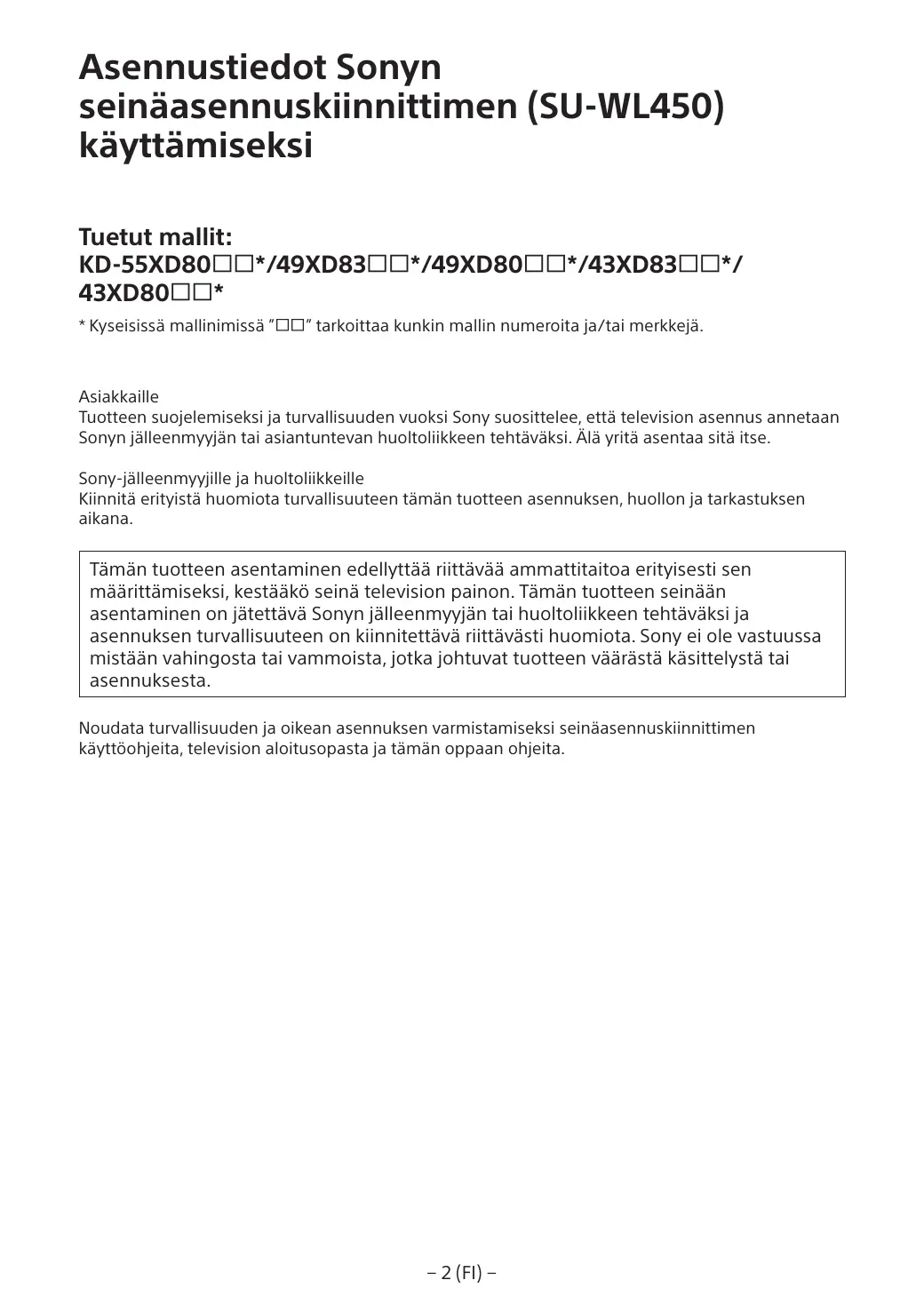 A l’attention des installateurs et revendeurs Sony Soyez particulièrement attentif à la sécurité pendant l’installation, l’entretien périodique et l’examen du produit.