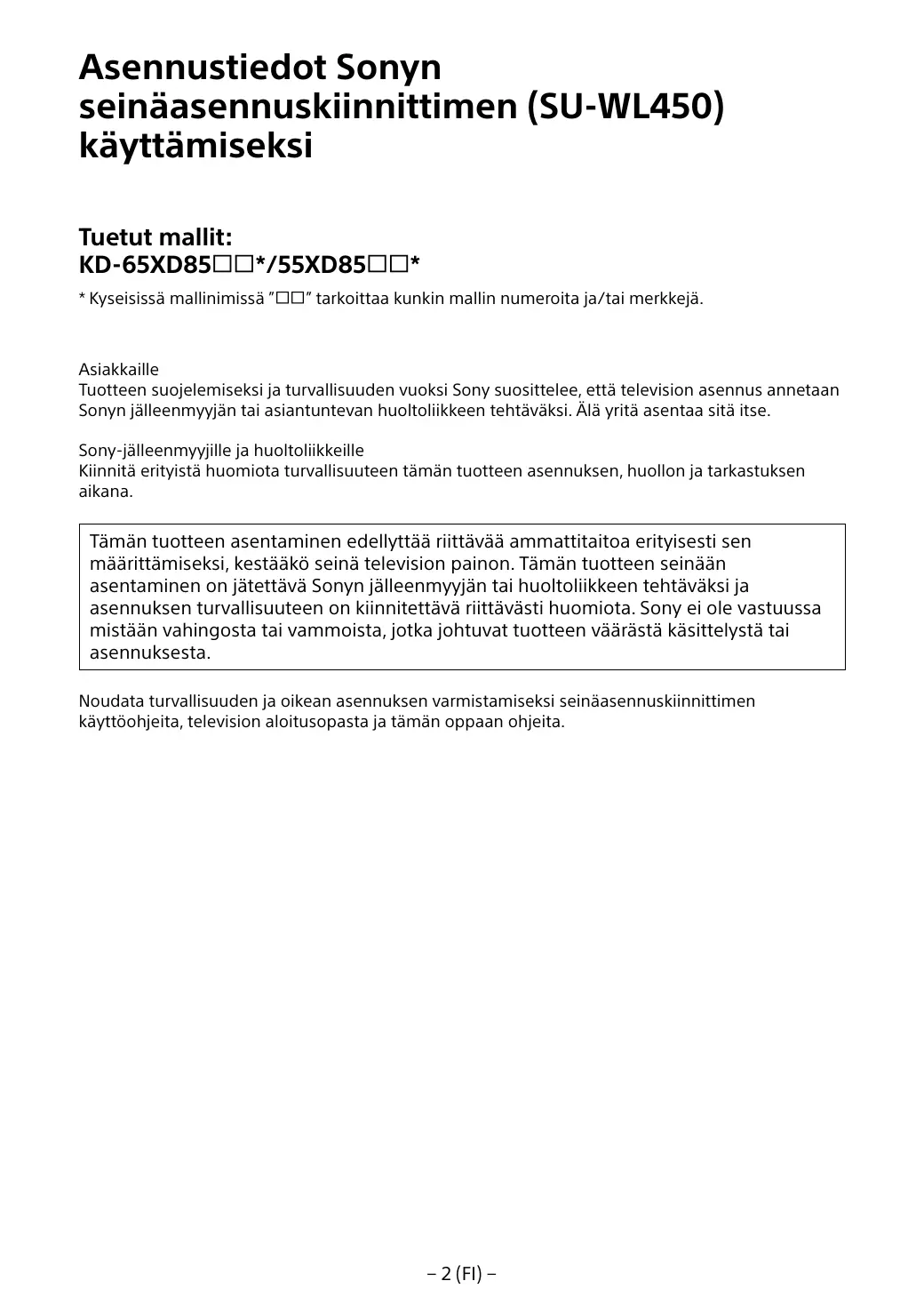 Asennustiedot Sonyn seinäasennuskiinnittimen (SU-WL450) käyttämiseksi Tuetut mallit: KD-65XD85*/55XD85* * Kyseisissä mallinimissä ”” tarkoittaa kunkin mallin numeroita ja/tai merkkejä.