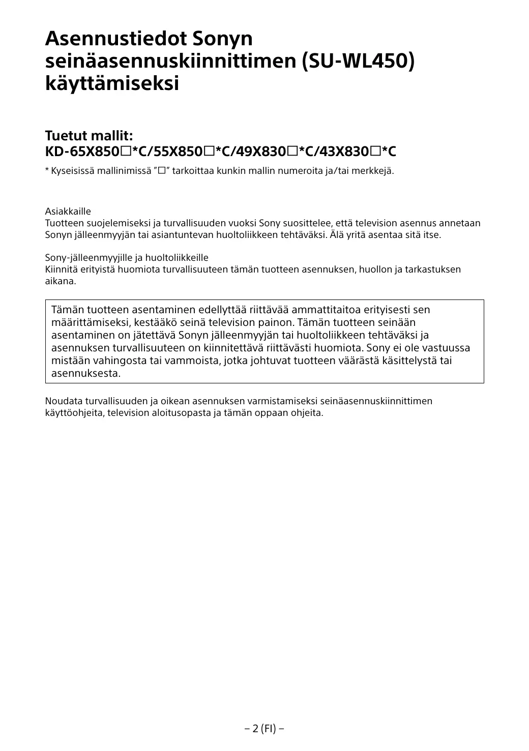 A l’attention des installateurs et revendeurs Sony Soyez particulièrement attentif à la sécurité pendant l’installation, l’entretien périodique et l’examen du produit.
