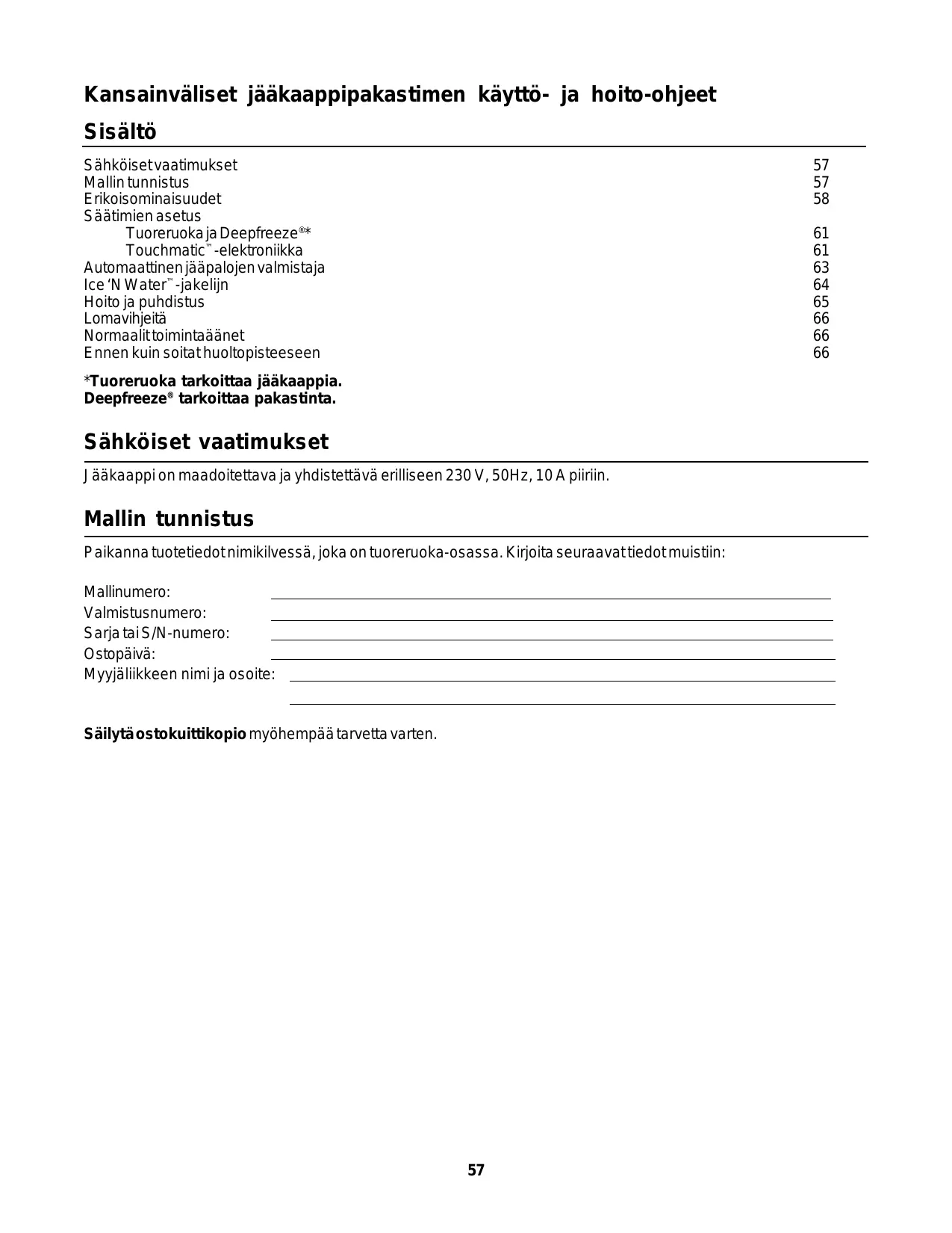 Kansainväliset jääkaappipakastimen käyttö- ja hoito-ohjeet Sisältö Sähköiset vaatimukset Mallin tunnistus Erikoisominaisuudet Säätimien asetus Tuoreruoka ja Deepfreeze®* Touchmatic™-elektroniikka Automaattinen jääpalojen valmistaja Ice ‘N Water™-jakelijn Hoito ja puhdistus Lomavihjeitä Normaalit toimintaäänet Ennen kuin soitat huoltopisteeseen