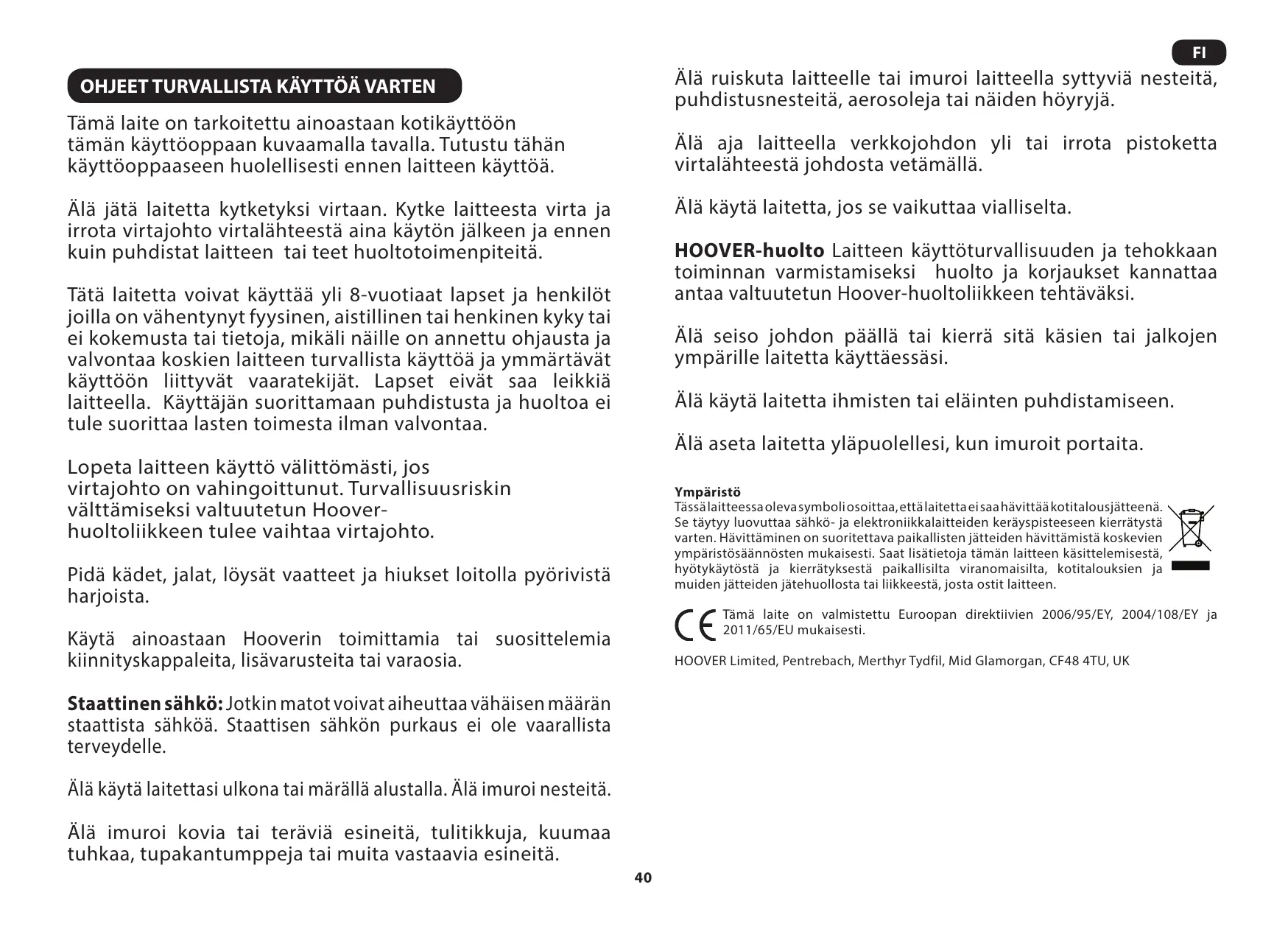 Service HOOVER: Pour assurer l’utilisation sûre et efficace de cet appareil, nous recommandons de n’en confier l’entretien ou les réparations qu’à un réparateur HOOVER agréé.