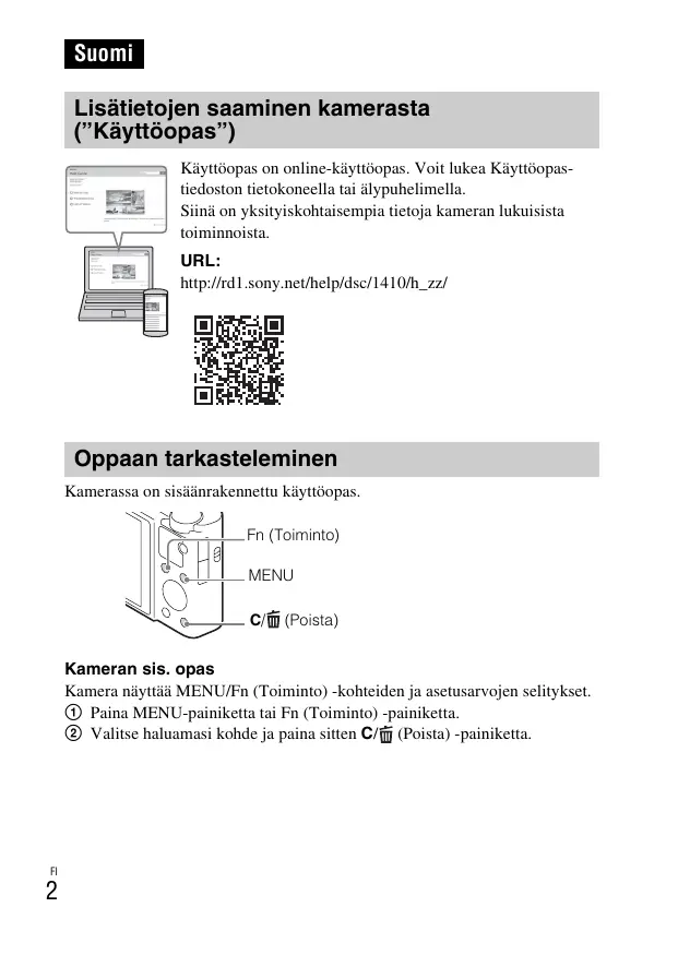 Suomi Lisätietojen saaminen kamerasta (”Käyttöopas”) Käyttöopas on online-käyttöopas. Voit lukea Käyttöopastiedoston tietokoneella tai älypuhelimella. Siinä on yksityiskohtaisempia tietoja kameran lukuisista toiminnoista. URL: http://rd1.sony.net/help/dsc/1410/h_zz/ Oppaan tarkasteleminen Kamerassa on sisäänrakennettu käyttöopas. Fn (Toiminto) MENU