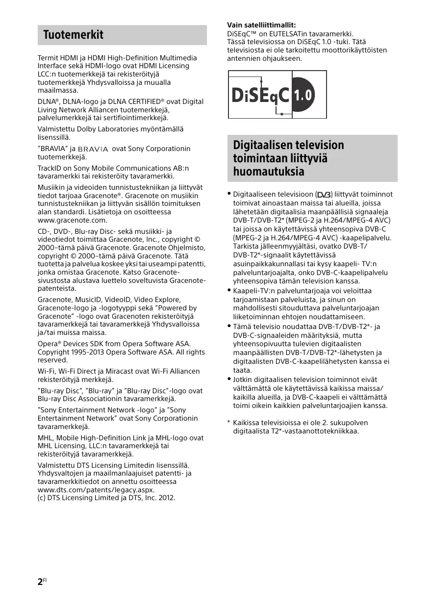 Billeder og illustrationer, som bruges i Guiden Hurtig start, Referencevejledning og Sikkerhedsoplysninger er kun vejledende og kan variere i forhold til produktets egentlige udseende. "x" i modelnavnet svarer til et numerisk ciffer vedrørende design, farve eller tv-system. Fjern ikke dummy-kortet fra TV CAM (Conditional Access Module)-holderen medmindre du vil indsætte et smartcard i CAM-holderen. Tilgængeligheden af ekstra tilbehør afhænger af land/område/tv-model/lager. Design og specifikationer kan ændres uden varsel. 6DK Tuotemerkit Termit HDMI ja HDMI High-Definition Multimedia Interface sekä HDMI-logo ovat HDMI Licensing LCC:n tuotemerkkejä tai rekisteröityjä tuotemerkkejä Yhdysvalloissa ja muualla maailmassa. Vain satelliittimallit: DiSEqC™ on EUTELSATin tavaramerkki. Tässä televisiossa on DiSEqC 1.0 -tuki. Tätä televisiosta ei ole tarkoitettu moottorikäyttöisten antennien ohjaukseen. DLNA®, DLNA-logo ja DLNA CERTIFIED® ovat Digital Living Network Alliancen tuotemerkkejä, palvelumerkkejä tai sertifiointimerkkejä. Valmistettu Dolby Laboratories myöntämällä lisenssillä. ”BRAVIA” ja tuotemerkkejä. ovat Sony Corporationin TrackID on Sony Mobile Communications AB:n tavaramerkki tai rekisteröity tavaramerkki. Musiikin ja videoiden tunnistustekniikan ja liittyvät tiedot tarjoaa Gracenote®. Gracenote on musiikin tunnistustekniikan ja liittyvän sisällön toimituksen alan standardi. Lisätietoja on osoitteessa www.gracenote.com. CD-, DVD-, Blu-ray Disc- sekä musiikki- ja videotiedot toimittaa Gracenote, Inc., copyright © 2000–tämä päivä Gracenote. Gracenote Ohjelmisto, copyright © 2000–tämä päivä Gracenote. Tätä tuotetta ja palvelua koskee yksi tai useampi patentti, jonka omistaa Gracenote. Katso Gracenotesivustosta alustava luettelo soveltuvista Gracenotepatenteista. Gracenote, MusicID, VideoID, Video Explore, Gracenote-logo ja -logotyyppi sekä ”Powered by Gracenote” -logo ovat Gracenoten rekisteröityjä tavaramerkkejä tai tavaramerkkejä Yhdysvalloissa ja/tai muissa maissa. Opera® Devices SDK from Opera Software ASA. Copyright 1995-2013 Opera Software ASA. All rights reserved. Wi-Fi, Wi-Fi Direct ja Miracast ovat Wi-Fi Alliancen rekisteröityjä merkkejä. ”Blu-ray Disc”, ”Blu-ray” ja ”Blu-ray Disc”-logo ovat Blu-ray Disc Associationin tavaramerkkejä. ”Sony Entertainment Network -logo” ja ”Sony Entertainment Network” ovat Sony Corporationin tavaramerkkejä. MHL, Mobile High-Definition Link ja MHL-logo ovat MHL Licensing, LLC:n tavaramerkkejä tai rekisteröityjä tavaramerkkejä. Valmistettu DTS Licensing Limitedin lisenssillä. Yhdysvaltojen ja maailmanlaajuiset patentti- ja tavaramerkkitiedot on annettu osoitteessa www.dts.com/patents/legacy.aspx. (c) DTS Licensing Limited ja DTS, Inc. 2012. 2FI Digitaalisen television toimintaan liittyviä huomautuksia Digitaaliseen televisioon ( ) liittyvät toiminnot toimivat ainoastaan maissa tai alueilla, joissa lähetetään digitaalisia maanpäällisiä signaaleja DVB-T/DVB-T2* (MPEG-2 ja H.264/MPEG-4 AVC) tai joissa on käytettävissä yhteensopiva DVB-C (MPEG-2 ja H.264/MPEG-4 AVC) -kaapelipalvelu. Tarkista jälleenmyyjältäsi, ovatko DVB-T/ DVB-T2*-signaalit käytettävissä asuinpaikkakunnallasi tai kysy kaapeli- TV:n palveluntarjoajalta, onko DVB-C-kaapelipalvelu yhteensopiva tämän television kanssa. Kaapeli-TV:n palveluntarjoaja voi veloittaa tarjoamistaan palveluista, ja sinun on mahdollisesti sitouduttava palveluntarjoajan liiketoiminnan ehtojen noudattamiseen. Tämä televisio noudattaa DVB-T/DVB-T2*- ja DVB-C-signaaleiden määrityksiä, mutta yhteensopivuutta tulevien digitaalisten maanpäällisten DVB-T/DVB-T2*-lähetysten ja digitaalisten DVB-C-kaapelilähetysten kanssa ei taata. Jotkin digitaalisen television toiminnot eivät välttämättä ole käytettävissä kaikissa maissa/ kaikilla alueilla, ja DVB-C-kaapeli ei välttämättä toimi oikein kaikkien palveluntarjoajien kanssa.