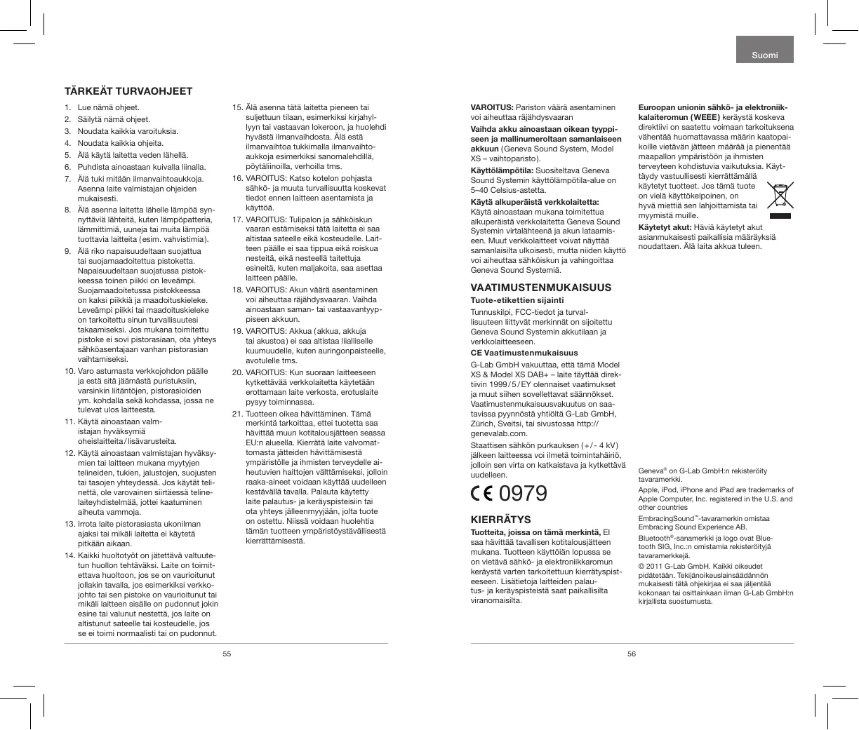 Euroopan unionin sähkö- ja elektroniikkalaiteromun ( WEEE ) keräystä koskeva direktiivi on saatettu voimaan tarkoituksena vähentää huomattavassa määrin kaatopaikoille vietävän jätteen määrää ja pienentää maapallon ympäristöön ja ihmisten terveyteen kohdistuvia vaikutuksia. Käyttäydy vastuullisesti kierrättämällä käytetyt tuotteet. Jos tämä tuote on vielä käyttökelpoinen, on hyvä miettiä sen lahjoittamista tai myymistä muille. Käytetyt akut: Häviä käytetyt akut asianmukaisesti paikallisia määräyksiä noudattaen. Älä laita akkua tuleen. VAROITUS: Pariston väärä asentaminen voi aiheuttaa räjähdysvaaran Vaihda akku ainoastaan oikean tyyppiseen ja mallinumeroltaan samanlaiseen akkuun ( Geneva Sound System, Model XS – vaihtoparisto ). Käyttölämpötila: Suositeltava Geneva Sound Systemin käyttölämpötila-alue on 5–40 Celsius-astetta. Käytä alkuperäistä verkkolaitetta: Käytä ainoastaan mukana toimitettua alkuperäistä verkkolaitetta Geneva Sound Systemin virtalähteenä ja akun lataamiseen. Muut verkkolaitteet voivat näyttää samanlaisilta ulkoisesti, mutta niiden käyttö voi aiheuttaa sähköiskun ja vahingoittaa Geneva Sound Systemiä. Vaatimustenmukaisuus Tuote-etikettien sijainti Tunnuskilpi, FCC-tiedot ja turvallisuuteen liittyvät merkinnät on sijoitettu Geneva Sound Systemin akkutilaan ja verkkolaitteeseen. CE Vaatimustenmukaisuus G-Lab GmbH vakuuttaa, että tämä Model XS & Model XS DAB+ – laite täyttää direktiivin 1999 / 5 / EY olennaiset vaatimukset ja muut siihen sovellettavat säännökset. Vaatimustenmukaisuusvakuutus on saatavissa pyynnöstä yhtiöltä G-Lab GmbH, Zürich, Sveitsi, tai sivustossa http:// genevalab.com. Staattisen sähkön purkauksen ( + / - 4 kV ) jälkeen laitteessa voi ilmetä toimintahäiriö, jolloin sen virta on katkaistava ja kytkettävä uudelleen. Geneva® on G-Lab GmbH:n rekisteröity tavaramerkki. Apple, iPod, iPhone and iPad are trademarks of Apple Computer, Inc. registered in the U.S. and other countries EmbracingSound™-tavaramerkin omistaa Embracing Sound Experience AB. Bluetooth®-sanamerkki ja logo ovat Bluetooth SIG, Inc.:n omistamia rekisteröityjä tavaramerkkejä. © 2011 G-Lab GmbH. Kaikki oikeudet pidätetään. Tekijänoikeuslainsäädännön mukaisesti tätä ohjekirjaa ei saa jäljentää kokonaan tai osittainkaan ilman G-Lab GmbH:n kirjallista suostumusta.