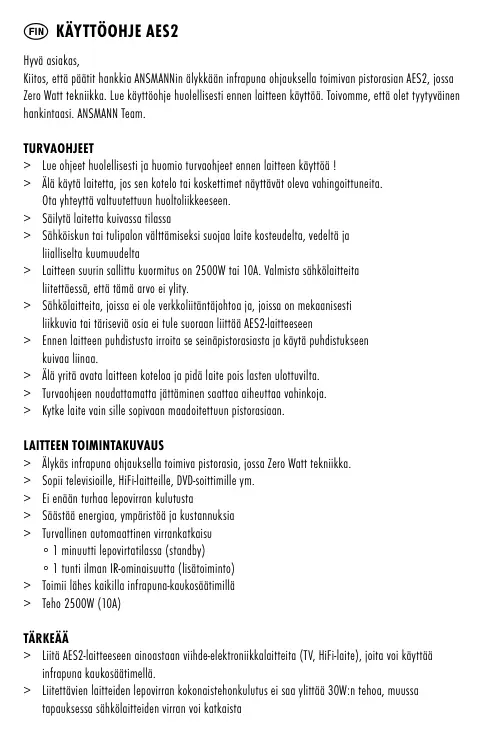 Hyvä asiakas, Kiitos, että päätit hankkia ANSMANNin älykkään infrapuna ohjauksella toimivan pistorasian AES2, jossa Zero Watt tekniikka. Lue käyttöohje huolellisesti ennen laitteen käyttöä. Toivomme, että olet tyytyväinen hankintaasi. ANSMANN Team. TURVAOHJEET > Lue ohjeet huolellisesti ja huomio turvaohjeet ennen laitteen käyttöä ! > Älä käytä laitetta, jos sen kotelo tai koskettimet näyttävät oleva vahingoittuneita. Ota yhteyttä valtuutettuun huoltoliikkeeseen. > Säilytä laitetta kuivassa tilassa > Sähköiskun tai tulipalon välttämiseksi suojaa laite kosteudelta, vedeltä ja liialliselta kuumuudelta > Laitteen suurin sallittu kuormitus on 2500W tai 10A. Valmista sähkölaitteita liitettäessä, että tämä arvo ei ylity. > Sähkölaitteita, joissa ei ole verkkoliitäntäjohtoa ja, joissa on mekaanisesti liikkuvia tai täriseviä osia ei tule suoraan liittää AES2-laitteeseen > Ennen laitteen puhdistusta irroita se seinäpistorasiasta ja käytä puhdistukseen kuivaa liinaa. > Älä yritä avata laitteen koteloa ja pidä laite pois lasten ulottuvilta. > Turvaohjeen noudattamatta jättäminen saattaa aiheuttaa vahinkoja. > Kytke laite vain sille sopivaan maadoitettuun pistorasiaan. LAITTEEN TOIMINTAKUVAUS > Älykäs infrapuna ohjauksella toimiva pistorasia, jossa Zero Watt tekniikka. > Sopii televisioille, HiFi-laitteille, DVD-soittimille ym. > Ei enään turhaa lepovirran kulutusta > Säästää energiaa, ympäristöä ja kustannuksia > Turvallinen automaattinen virrankatkaisu ∘ 1 minuutti lepovirtatilassa (standby) ∘ 1 tunti ilman IR-ominaisuutta (lisätoiminto) > Toimii lähes kaikilla infrapuna-kaukosäätimillä > Teho 2500W (10A) TÄRKEÄÄ > Liitä AES2-laitteeseen ainoastaan viihde-elektroniikkalaitteita (TV, HiFi-laite), joita voi käyttää infrapuna kaukosäätimellä. > Liitettävien laitteiden lepovirran kokonaistehonkulutus ei saa ylittää 30W:n tehoa, muussa tapauksessa sähkölaitteiden virran voi katkaista ainostaan infrapuna ajastimen avulla, mutta ei lepovirtatilassa. > Video-laitteiden, tallentavien DVD-laitteiden ja muiden tallentavien laitteiden käyttö AES2-laitteella ei ole suositeltavaa, sillä AES2-laite katkaisee sähkövirran kokonaan ja näinollen näiden sähkölaitteiden ajastin- ja muut asetukset nollaantuvat.