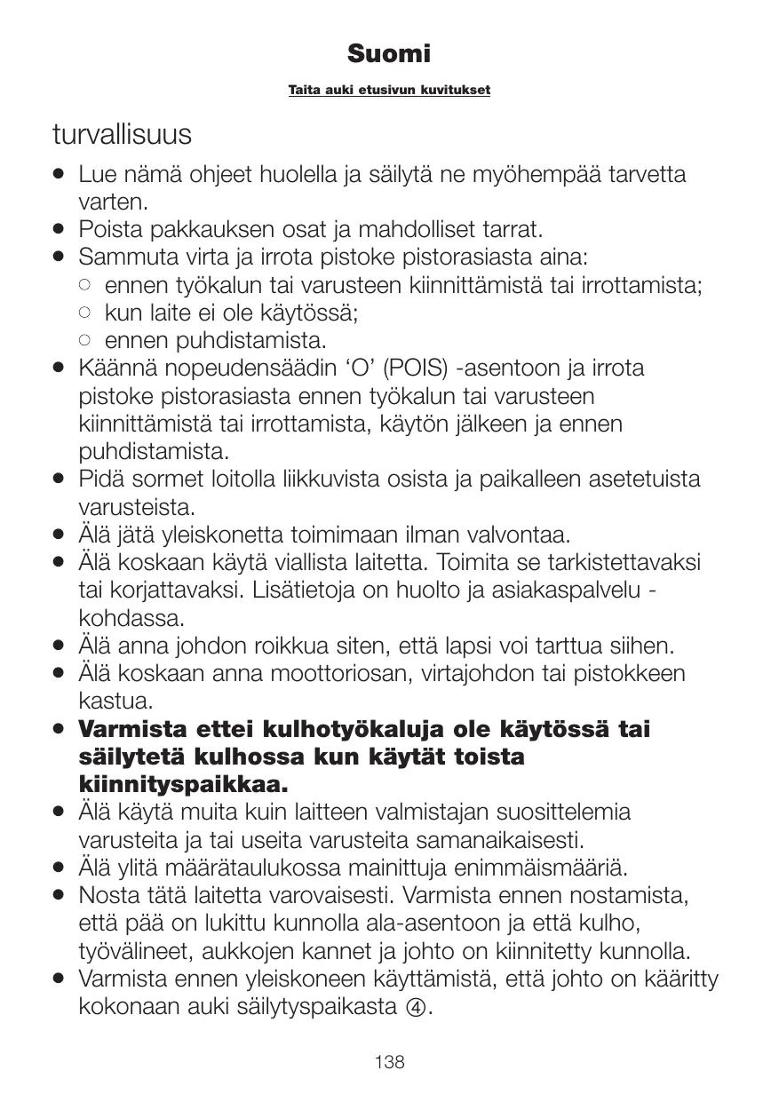 Lue nämä ohjeet huolella ja säilytä ne myöhempää tarvetta varten. Poista pakkauksen osat ja mahdolliset tarrat. Sammuta virta ja irrota pistoke pistorasiasta aina: l ennen työkalun tai varusteen kiinnittämistä tai irrottamista; l kun laite ei ole käytössä; l ennen puhdistamista. Käännä nopeudensäädin ‘O’ (POIS) -asentoon ja irrota pistoke pistorasiasta ennen työkalun tai varusteen kiinnittämistä tai irrottamista, käytön jälkeen ja ennen puhdistamista. Pidä sormet loitolla liikkuvista osista ja paikalleen asetetuista varusteista. Älä jätä yleiskonetta toimimaan ilman valvontaa. Älä koskaan käytä viallista laitetta. Toimita se tarkistettavaksi tai korjattavaksi. Lisätietoja on huolto ja asiakaspalvelu kohdassa. Älä anna johdon roikkua siten, että lapsi voi tarttua siihen. Älä koskaan anna moottoriosan, virtajohdon tai pistokkeen kastua. Varmista ettei kulhotyökaluja ole käytössä tai säilytetä kulhossa kun käytät toista kiinnityspaikkaa. Älä käytä muita kuin laitteen valmistajan suosittelemia varusteita ja tai useita varusteita samanaikaisesti. Älä ylitä määrätaulukossa mainittuja enimmäismääriä. Nosta tätä laitetta varovaisesti. Varmista ennen nostamista, että pää on lukittu kunnolla ala-asentoon ja että kulho, työvälineet, aukkojen kannet ja johto on kiinnitetty kunnolla. Varmista ennen yleiskoneen käyttämistä, että johto on kääritty kokonaan auki säilytyspaikasta 4.