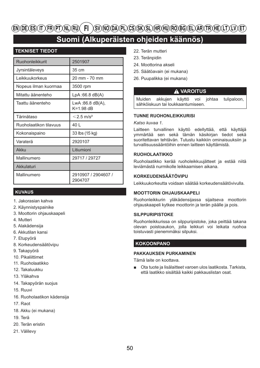 KÄYTTÖOHJE G40LM35 - G40LM35K2 - G40LM41 - G40LM45K4 - GD40LM45 - GD40LM46SP GREENWORKS