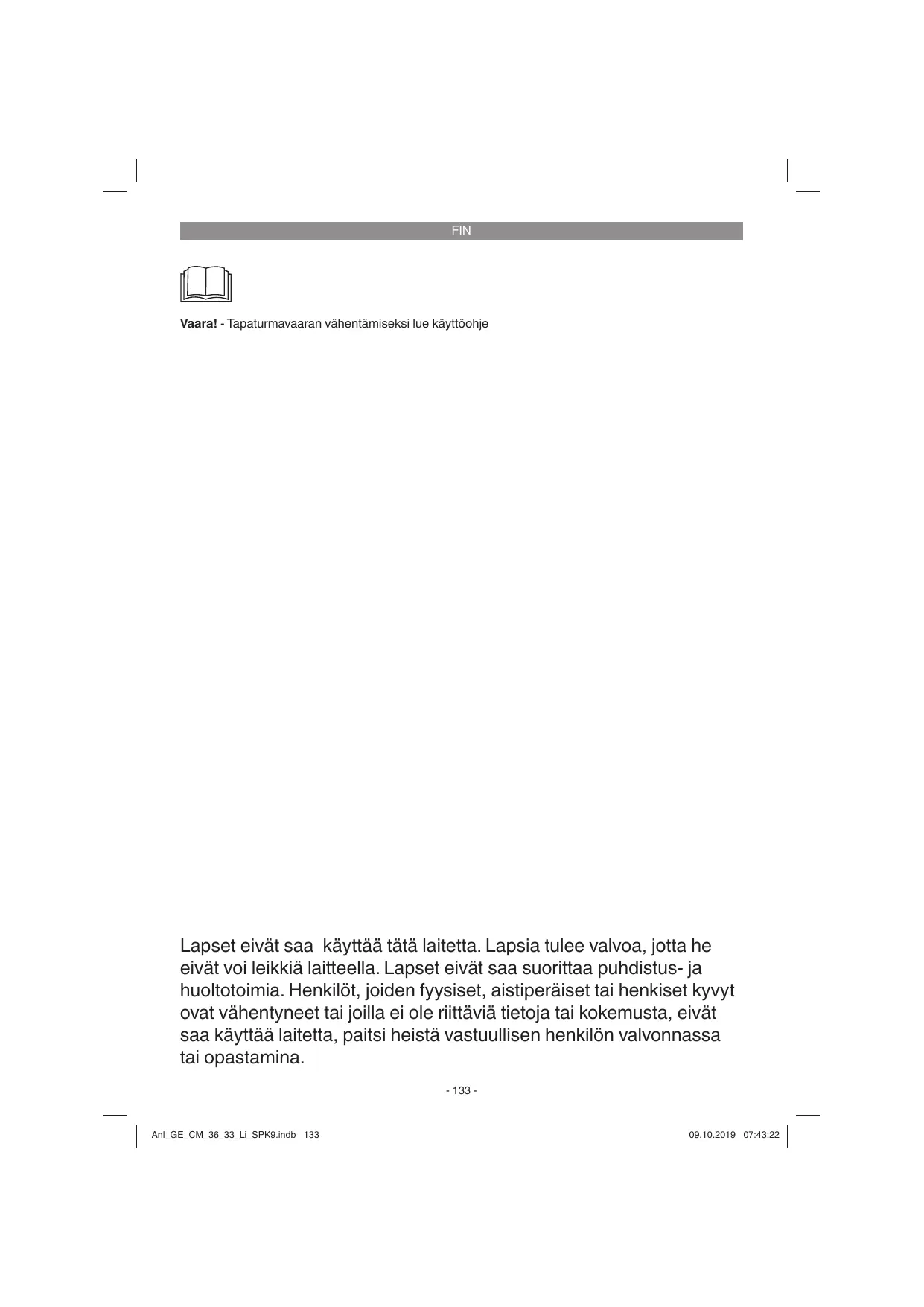 Lapset eivät saa käyttää tätä laitetta. Lapsia tulee valvoa, jotta he eivät voi leikkiä laitteella. Lapset eivät saa suorittaa puhdistus- ja huoltotoimia. Henkilöt, joiden fyysiset, aistiperäiset tai henkiset kyvyt ovat vähentyneet tai joilla ei ole riittäviä tietoja tai kokemusta, eivät saa käyttää laitetta, paitsi heistä vastuullisen henkilön valvonnassa tai opastamina. - 133 -