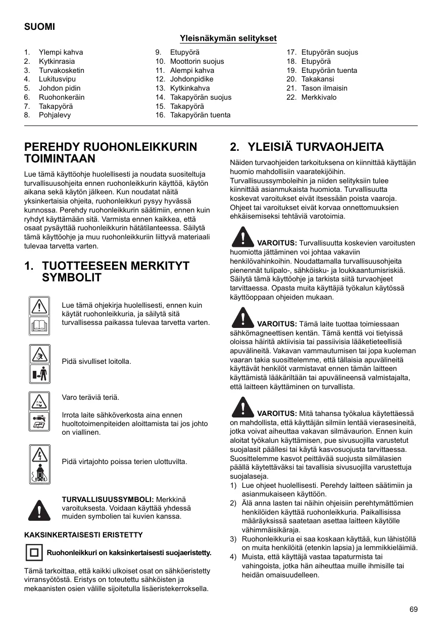 1. TUOTTEESEEN MERKITYT SYMBOLIT Lue tämä ohjekirja huolellisesti, ennen kuin käytät ruohonleikkuria, ja säilytä sitä turvallisessa paikassa tulevaa tarvetta varten.