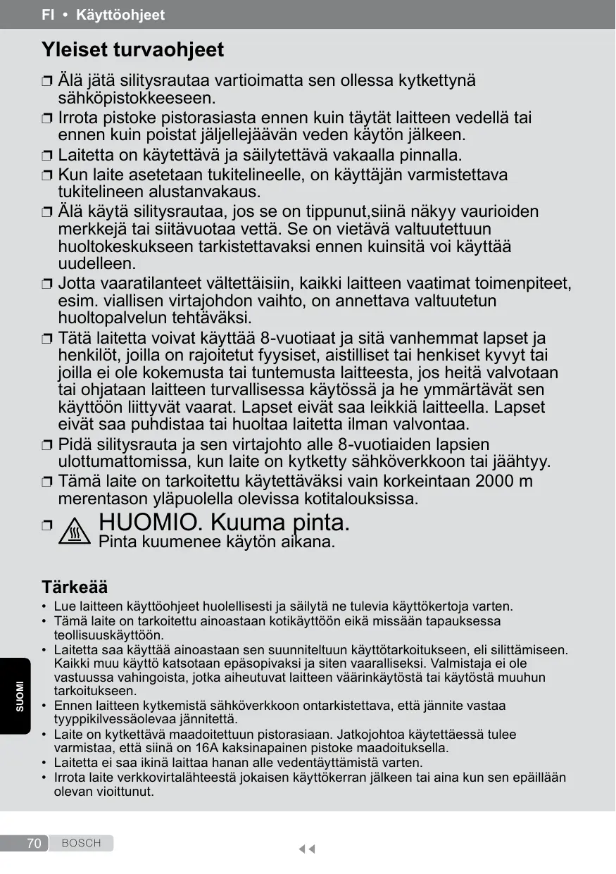 sähköpistokkeeseen. Irrota pistoke pistorasiasta ennen kuin täytät laitteen vedellä tai ennen kuin poistat jäljellejäävän veden käytön jälkeen. Laitetta on käytettävä ja säilytettävä vakaalla pinnalla. Kun laite asetetaan tukitelineelle, on käyttäjän varmistettava tukitelineen alustanvakaus. Älä käytä silitysrautaa, jos se on tippunut,siinä näkyy vaurioiden merkkejä tai siitävuotaa vettä. Se on vietävä valtuutettuun huoltokeskukseen tarkistettavaksi ennen kuinsitä voi käyttää uudelleen. Jotta vaaratilanteet vältettäisiin, kaikki laitteen vaatimat toimenpiteet, esim. viallisen virtajohdon vaihto, on annettava valtuutetun huoltopalvelun tehtäväksi. Tätä laitetta voivat käyttää 8-vuotiaat ja sitä vanhemmat lapset ja henkilöt, joilla on rajoitetut fyysiset, aistilliset tai henkiset kyvyt tai joilla ei ole kokemusta tai tuntemusta laitteesta, jos heitä valvotaan tai ohjataan laitteen turvallisessa käytössä ja he ymmärtävät sen käyttöön liittyvät vaarat. Lapset eivät saa leikkiä laitteella. Lapset eivät saa puhdistaa tai huoltaa laitetta ilman valvontaa. Pidä silitysrauta ja sen virtajohto alle 8-vuotiaiden lapsien ulottumattomissa, kun laite on kytketty sähköverkkoon tai jäähtyy. Tämä laite on tarkoitettu käytettäväksi vain korkeintaan 2000 m merentason yläpuolella olevissa kotitalouksissa.