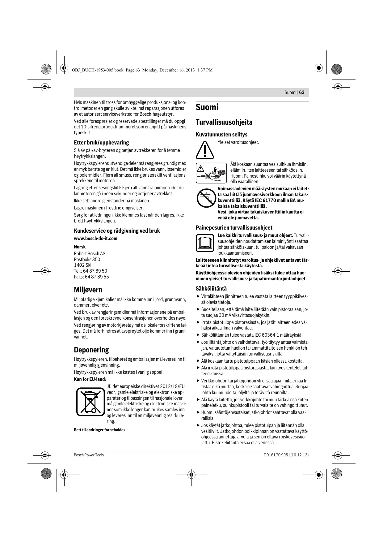 4,7 1,5 F 016 L70 995 | (16.12.13) OBJ_BUCH-1953-005.book Page 66 Monday, December 16, 2013 1:37 PM 66 | Suomi Standardinmukaisuusvakuutus Vakuutamme yksin vastaavamme siitä, että kohdassa ”Tekniset tiedot” selostettu tuote vastaa seuraavia standardeja tai standardoituja asiakirjoja: EN 60335 direktiivien 2011/65/EU, 2004/108/EY, 2006/42/EY, 2000/14/EY määräysten mukaan. 2000/14/EY: Taattu äänen tehotaso Yhteensopivuuden arviointimenetelmä liitteen V mukaan. Tuotelaji: 27 Tekninen tiedosto (2006/42/EY, 2000/14/EY): Bosch Lawn and Garden Ltd., PT-LG/ENS23, Stowmarket, Suffolk IP14 1EY, England Henk Becker Helmut Heinzelmann Executive Vice President Head of Product Certification Engineering PT/ETM9 Robert Bosch GmbH, Power Tools Division D-70745 Leinfelden-Echterdingen