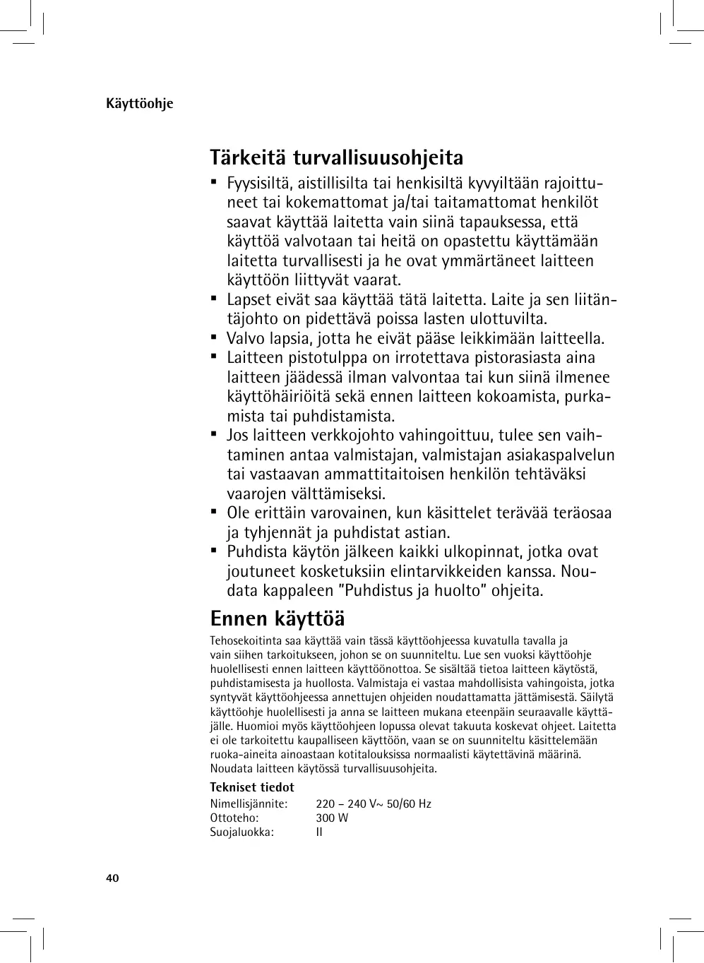 Le mixeur ne doit être utilisé que pour l’usage prévu conformément à ce mode d’emploi. Lisez pour cette raison minutieusement le manuel d’utilisation avant la mise en service. Il contient des consignes importantes pour l’utilisation, le nettoyage et l’entretien de l’appareil. Nous déclinons toute responsabilité pour des dommages éventuels dus au non-respect des consignes. Conservez soigneusement ce manuel d’utilisation et transmettez-le avec l’appareil en cas de remise à une tierce personne. Consultez également les informations de garantie à la fin de ce manuel d’utilisation. L’appareil n’est pas destiné à un usage professionnel, mais à la préparation d’aliments dans des portions familiales. Respecter les consignes de sécurité lors de l’utilisation.
