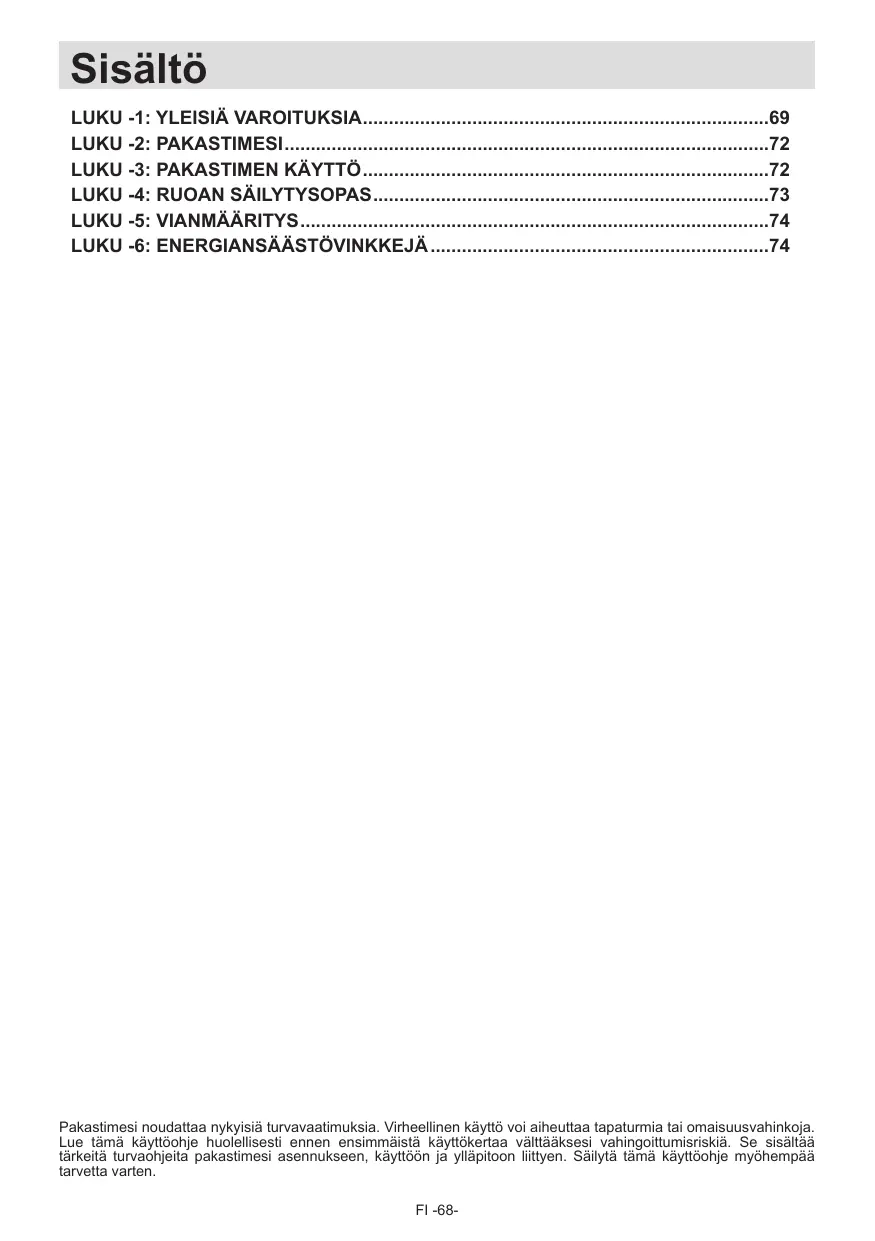 Pakastimesi noudattaa nykyisiä turvavaatimuksia. Virheellinen käyttö voi aiheuttaa tapaturmia tai omaisuusvahinkoja. Lue tämä käyttöohje huolellisesti ennen ensimmäistä käyttökertaa välttääksesi vahingoittumisriskiä. Se sisältää tärkeitä turvaohjeita pakastimesi asennukseen, käyttöön ja ylläpitoon liittyen. Säilytä tämä käyttöohje myöhempää tarvetta varten. FI -68-