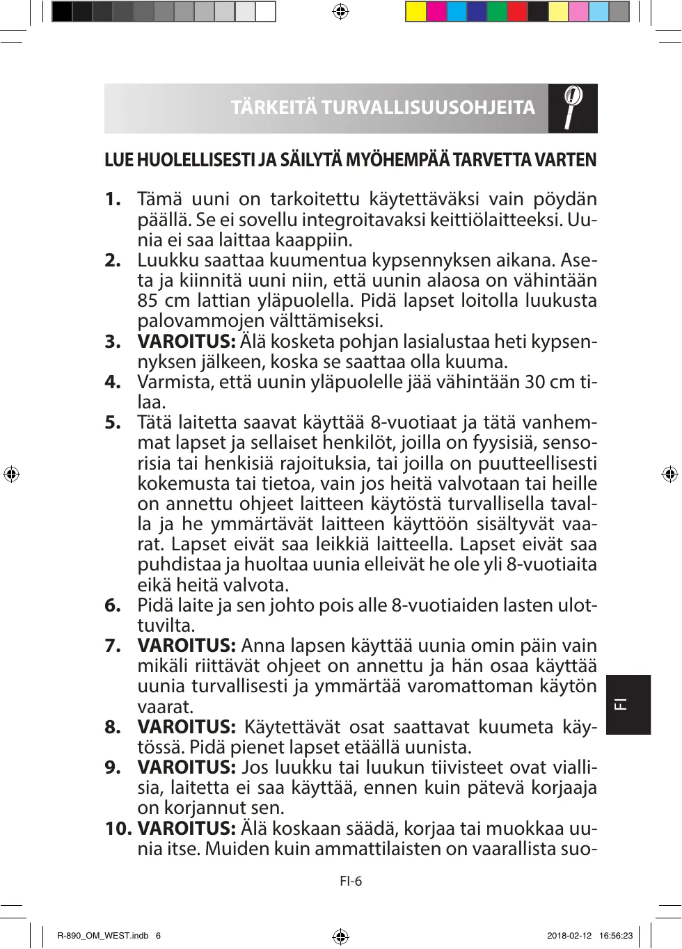 5. Tätä laitetta saavat käyttää 8-vuotiaat ja tätä vanhemmat lapset ja sellaiset henkilöt, joilla on fyysisiä, sensorisia tai henkisiä rajoituksia, tai joilla on puutteellisesti kokemusta tai tietoa, vain jos heitä valvotaan tai heille on annettu ohjeet laitteen käytöstä turvallisella tavalla ja he ymmärtävät laitteen käyttöön sisältyvät vaarat. Lapset eivät saa leikkiä laitteella. Lapset eivät saa puhdistaa ja huoltaa uunia elleivät he ole yli 8-vuotiaita eikä heitä valvota.