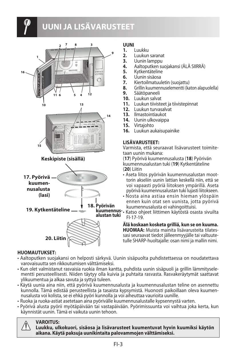LISÄVARUSTEET: Varmista, että seuraavat lisävarusteet toimitetaan uunin mukana: (17) Pyörivä kuumennusalusta (18) Pyörivän Keskipiste (sisällä) kuumennusalustan tuki (19) Kytkentäteline (20) Liitin • Aseta liitos pyörivän kuumennusalustan moot17. Pyörivä torin akseliin uunin lattian keskellä niin, että se kuumenvoi vapaasti pyöriä liitoksen ympärillä. Aseta nusalusta pyörivä kuumennusalustan tuki lujasti liitokseen. (lasi) • Nosta aina astiaa ensin hieman ylöspäin ennen kuin otat sen uunista, jotta pyörivä 18. Pyörivän kuumennusalusta ei vahingoittuisi. 19. Kytkentäteline kuumennus- • Katso ohjeet liittimen käytöstä osasta sivuilta alustan tuki FI-17-19. Älä koskaan kosketa grilliä, kun se on kuuma. HUOMAA: Muista mainita lisävarusteita tilatessasi seuraavat tiedot jälleenmyyjälle tai valtuute20. Liitin tulle SHARP-huoltajalle: osan nimi ja mallin nimi. 15