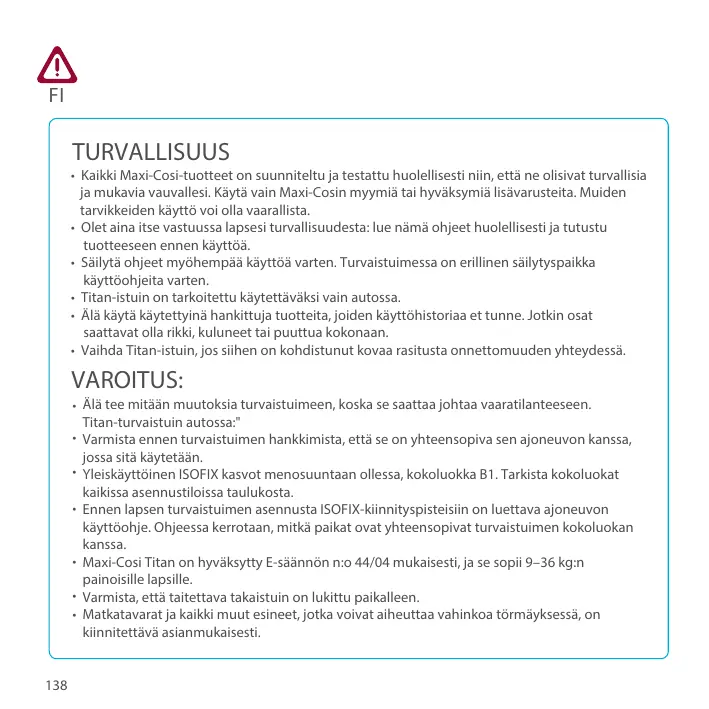 VAROITUS: • Älä tee mitään muutoksia turvaistuimeen, koska se saattaa johtaa vaaratilanteeseen. Titan-turvaistuin autossa:" • Varmista ennen turvaistuimen hankkimista, että se on yhteensopiva sen ajoneuvon kanssa, jossa sitä käytetään. • Yleiskäyttöinen ISOFIX kasvot menosuuntaan ollessa, kokoluokka B1. Tarkista kokoluokat kaikissa asennustiloissa taulukosta. • Ennen lapsen turvaistuimen asennusta ISOFIX-kiinnityspisteisiin on luettava ajoneuvon käyttöohje. Ohjeessa kerrotaan, mitkä paikat ovat yhteensopivat turvaistuimen kokoluokan kanssa. • Maxi-Cosi Titan on hyväksytty E-säännön n:o 44/04 mukaisesti, ja se sopii 9–36 kg:n painoisille lapsille. • Varmista, että taitettava takaistuin on lukittu paikalleen. • Matkatavarat ja kaikki muut esineet, jotka voivat aiheuttaa vahinkoa törmäyksessä, on kiinnitettävä asianmukaisesti. 138
