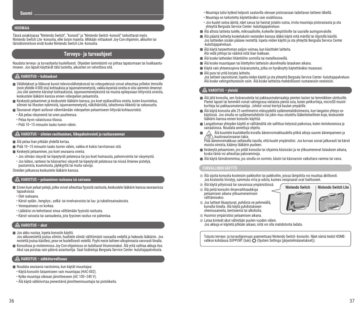 Si de la condensation se forme, éteignez la console et attendez que les gouttelettes d'eau s'évaporent. N'utilisez pas la console dans des endroits poussiéreux ou enfumés. Nintendo Switch Nintendo Switch Lite Lorsque vous jouez, n'obstruez ni les grilles ni les entrées de ventilation de la console afin d'éviter toute surchauffe de celle-ci. Si un élément de la console est sale, essuyez-le à l'aide d'un chiffon doux et sec. Évitez l'utilisation de diluant, de benzène ou d'alcool. Soyez attentif à ce qui vous entoure lorsque vous utilisez la console. Assurez-vous de recharger les batteries au moins une fois tous les six mois. Les batteries qui ne sont pas utilisées pendant une période prolongée peuvent devenir impossible à recharger. Lisez attentivement les informations sur la santé et la sécurité sur la console Nintendo Switch une fois qu'elle est paramétrée. Ces informations sont accessibles en sélectionnant (paramètres de la console) puis ASSISTANCE dans le menu HOME.